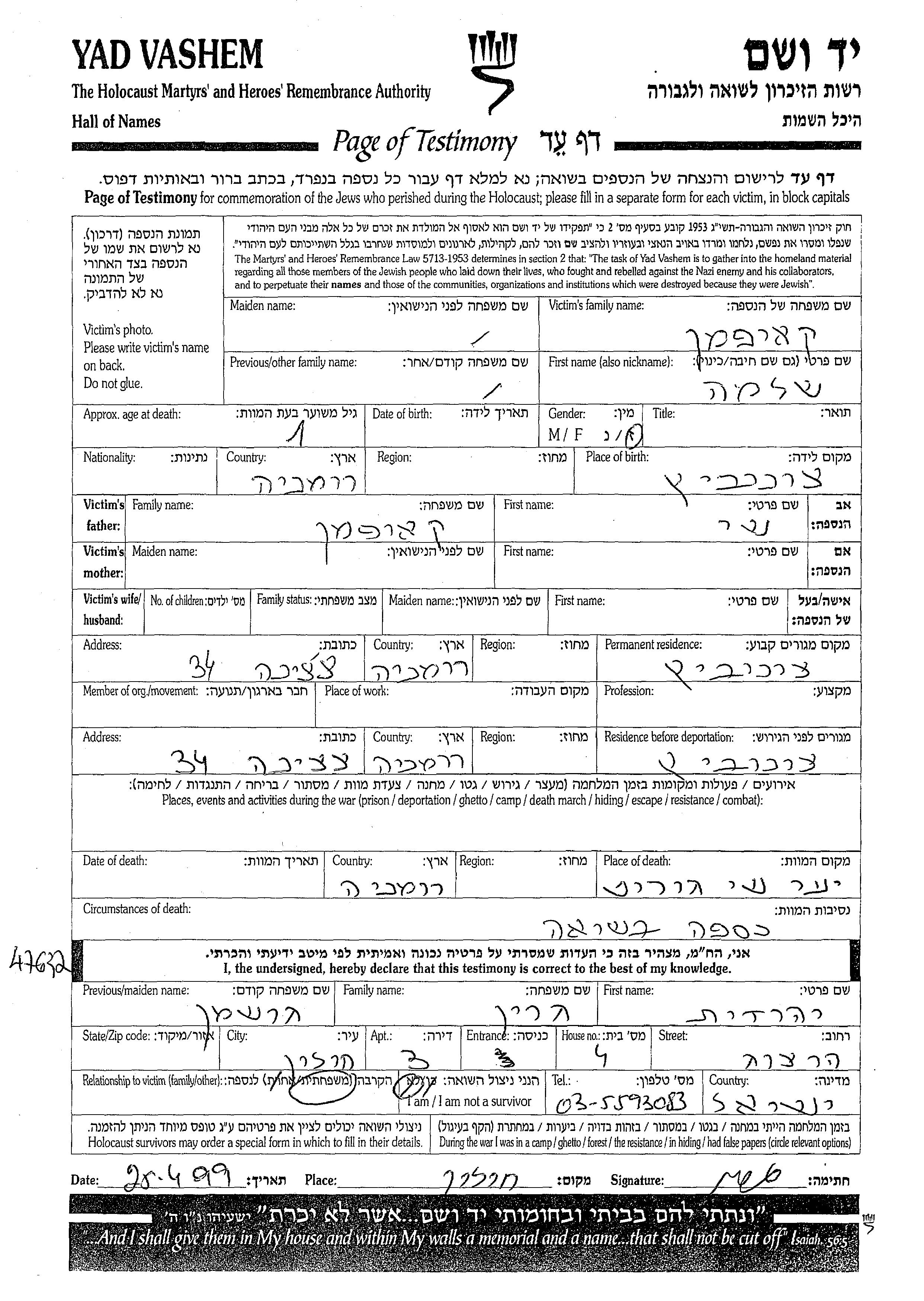 Shlomo wurde in der Schoah ermordet. Todesort: Czernowitz, Rumänien.