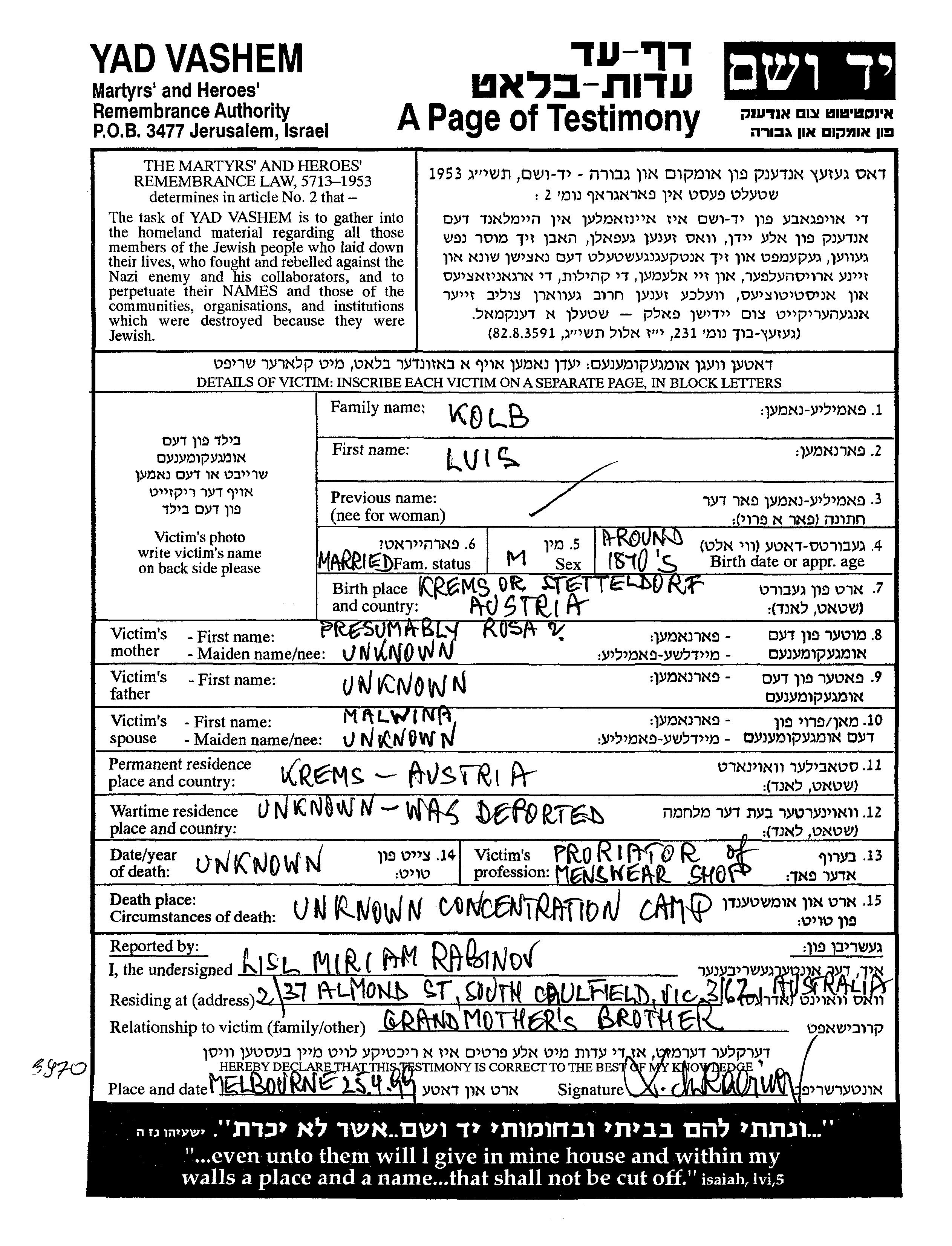 Luis Kolb wurde im Jahr 1870 in Krems, Österreich geboren. Er war der Sohn von Rosa. Er war Inhaber eines herrenbekleidungsgeschäfts und mit Malwina Verheiratet. Vor dem Zweiten Weltkrieg lebte er in Krems, Österreich.