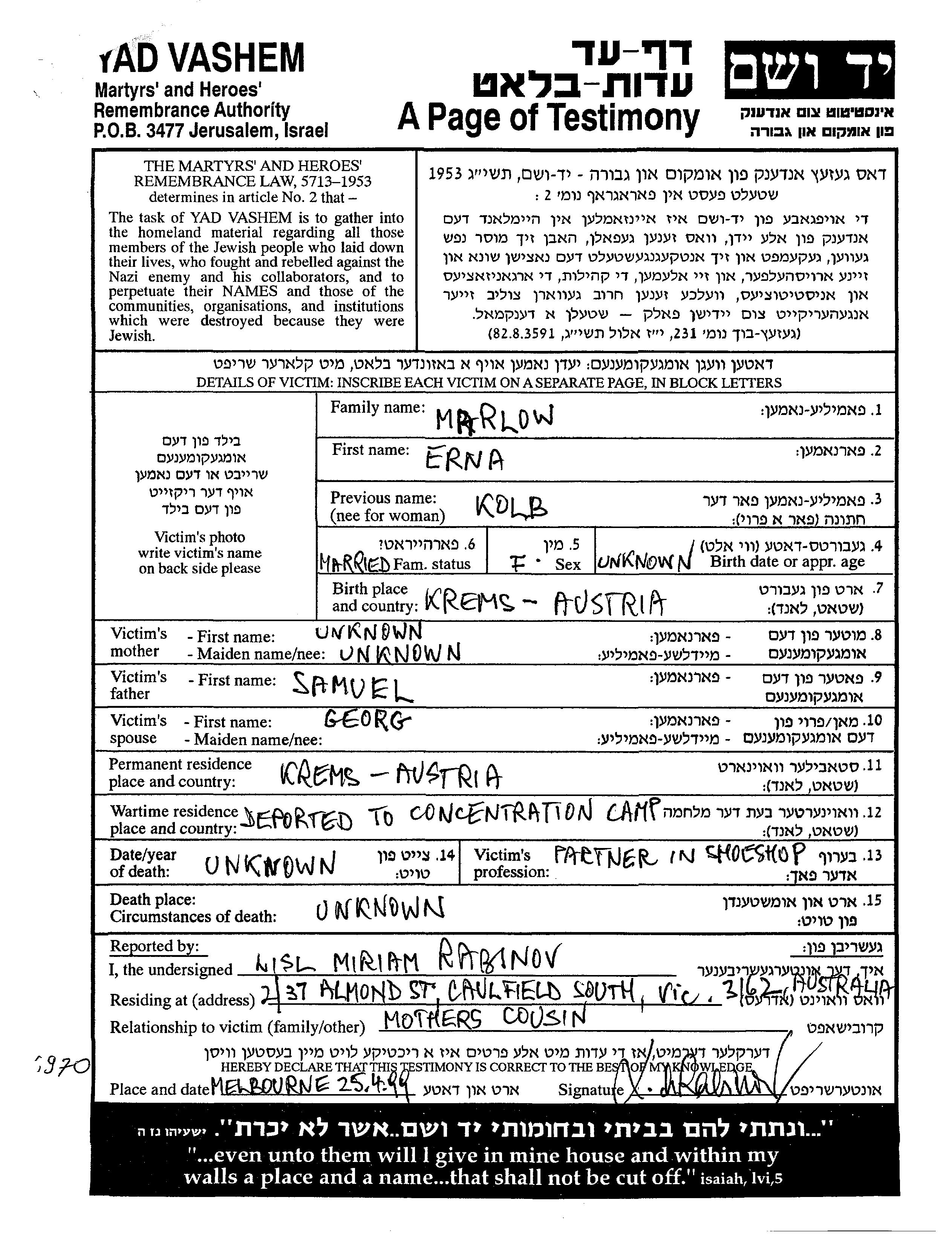 Erna Marlow, geb. Kolb wurde in Krems, Österreich geboren. Sie war die Tochter von Samuel. Sie war Partner in store und mit Georg Verheiratet. Vor dem Zweiten Weltkrieg lebte sie in Krems, Österreich.