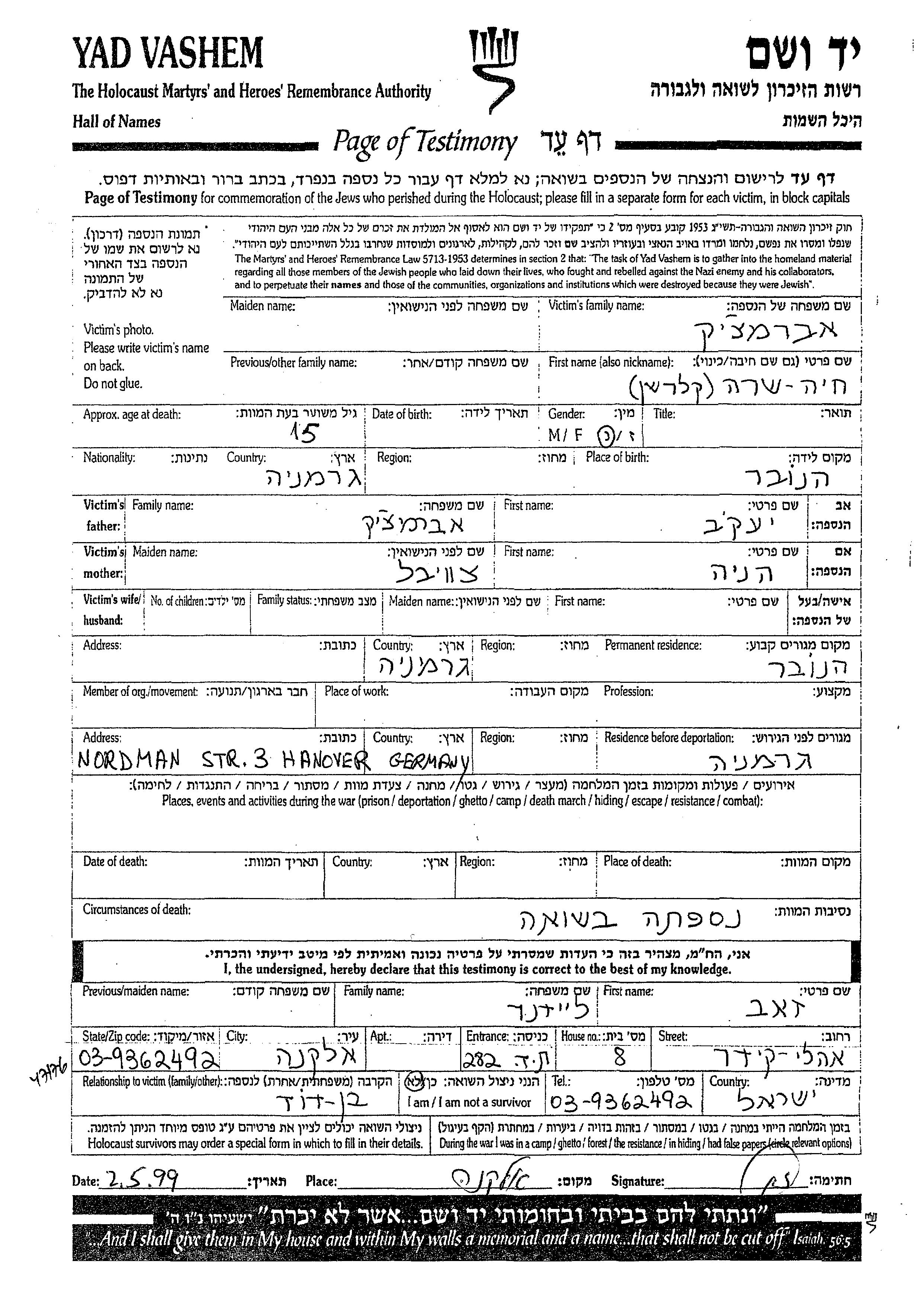 Abramchik Sara Khaia Hannover, Deutsches Reich Gedenkblatt