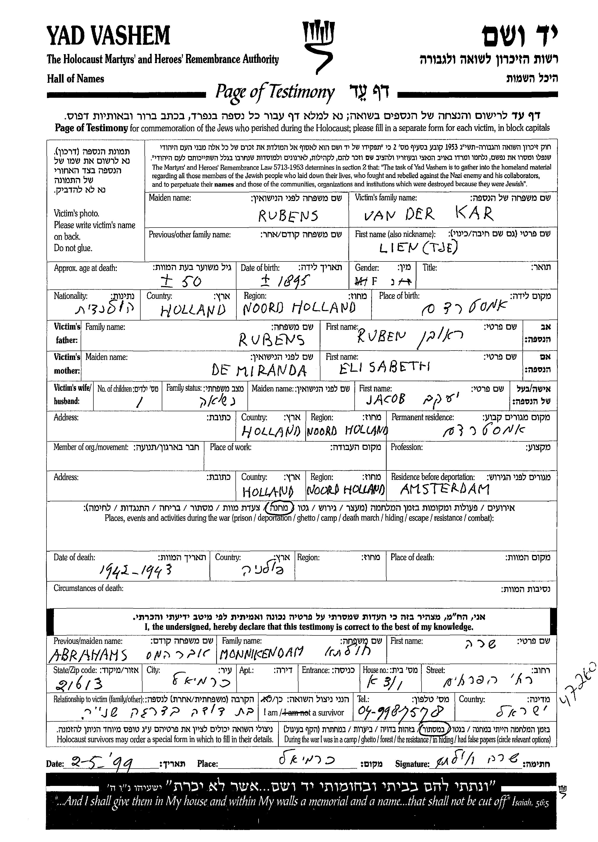 Lien Kar van der, geb. Rubens wurde im Jahr 1895 in Amsterdam, Niederlande geboren. Sie war die Tochter von Reuven und Elisabeth, geb. Miranda de. Sie war mit Yaakov Verheiratet. Vor dem Zweiten Weltkrieg lebte sie in Amsterdam, Niederlande. Während des Krieges war sie in Amsterdam, Niederlande.