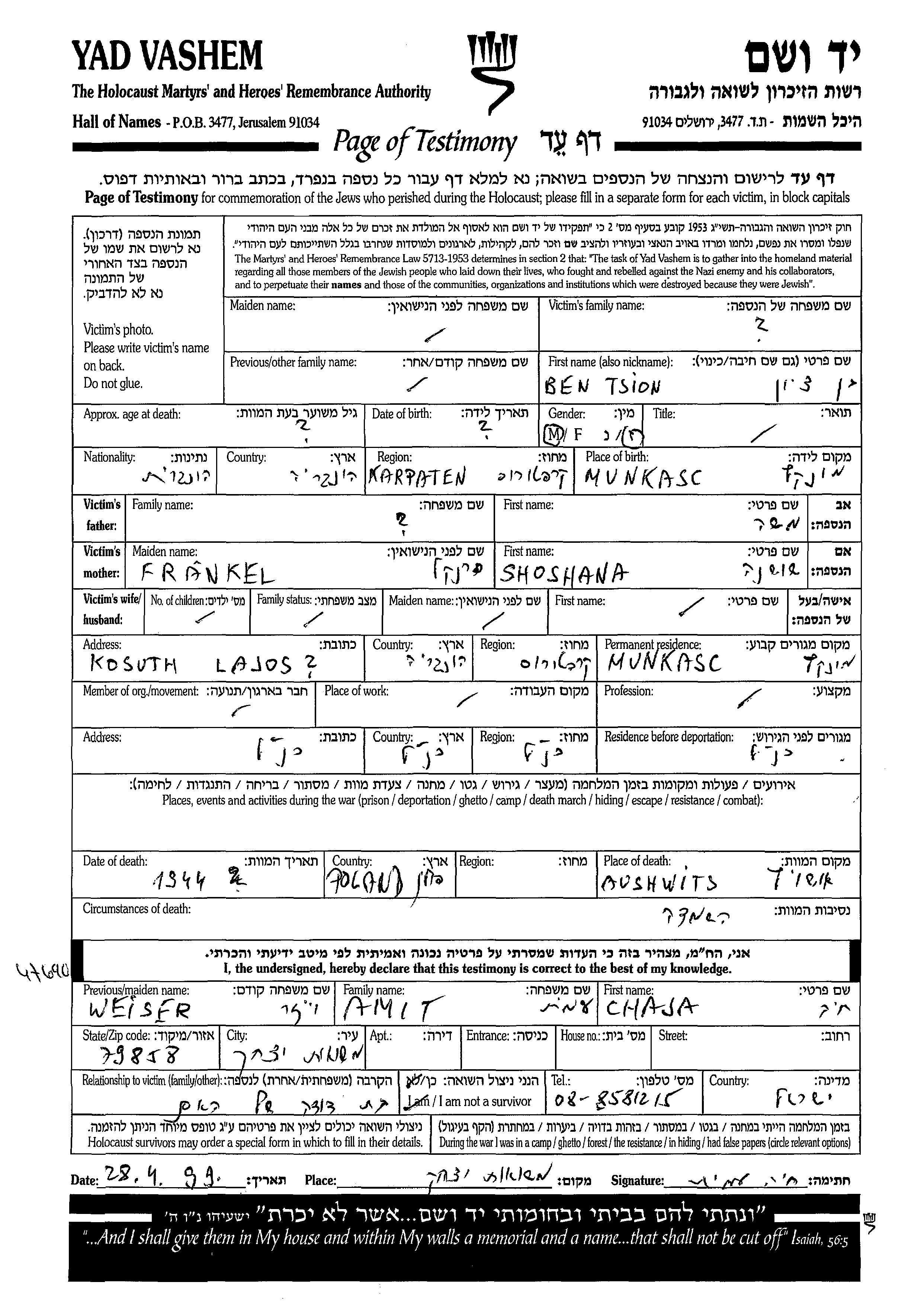 Ben Tsion wurde in der Schoah ermordet. Todesort: Auschwitz, Polen im Jahr 1944.