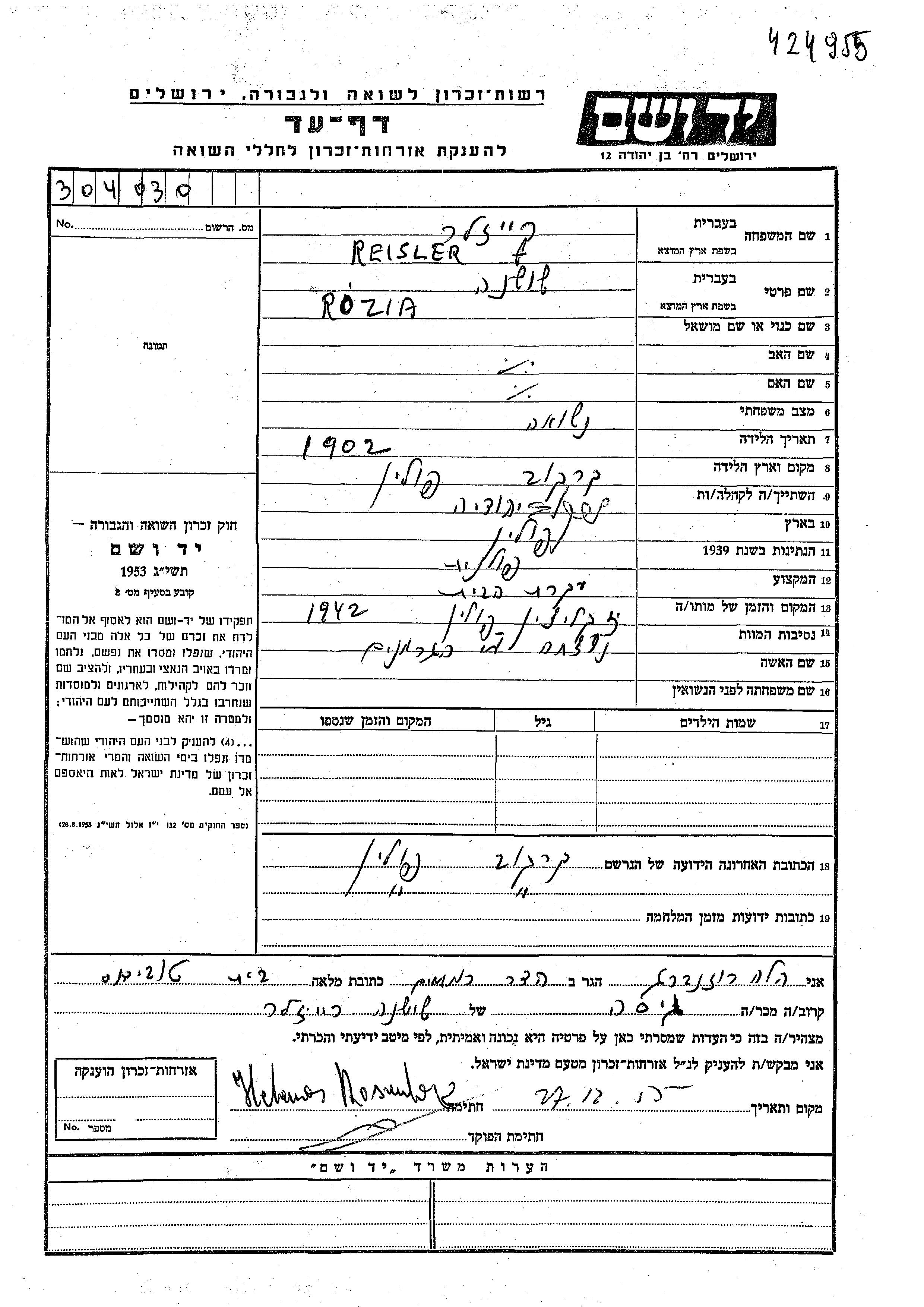 Rozia Shoshana Reisler Reizler wurde im Jahr 1902 in Krakow, Polen geboren. Sie war Hausfrau. Während des Krieges war sie in Krakow, Polen.