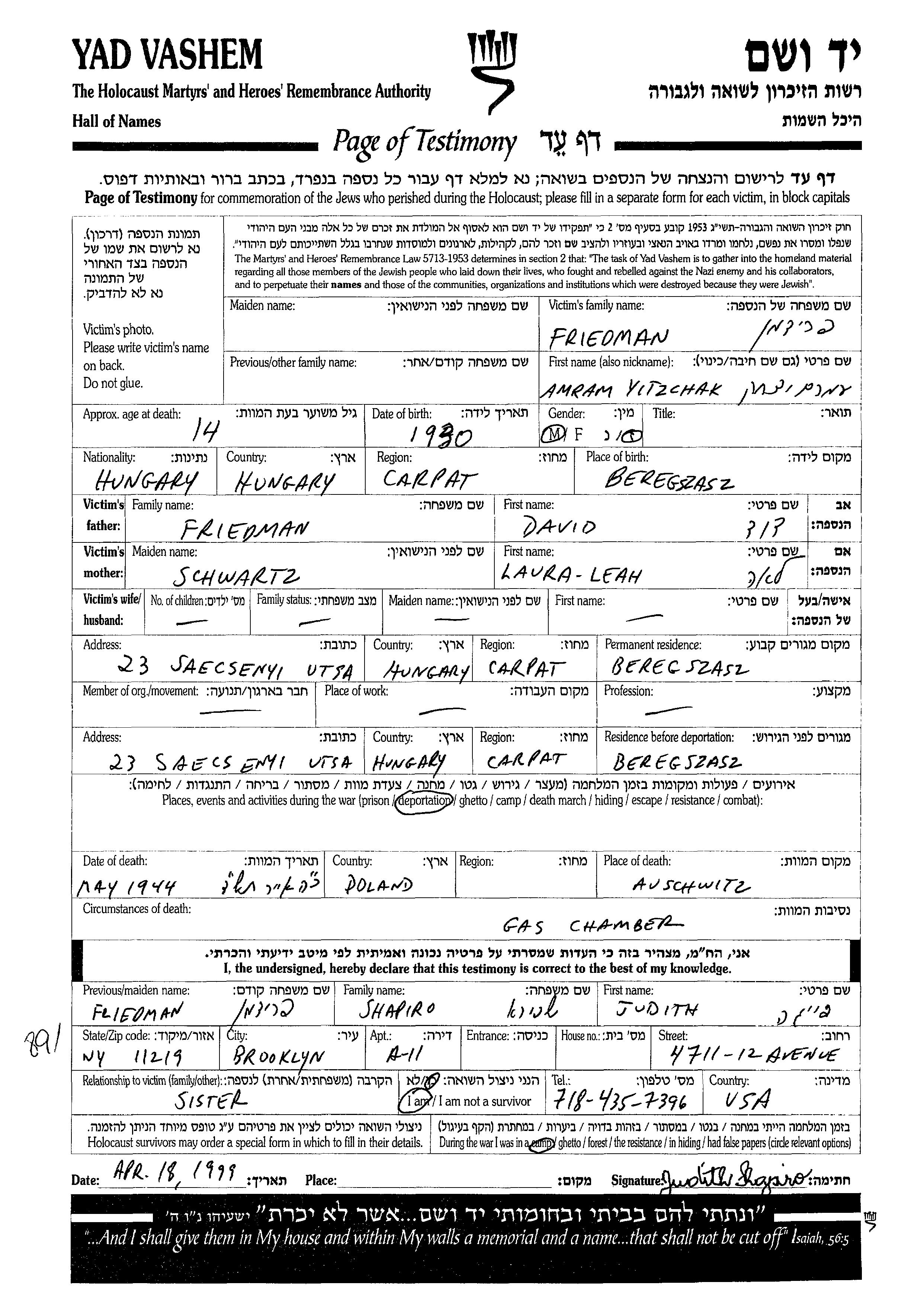 Amram Yitzkhak Friedman wurde im Jahr 1930 in Bereg Saz, Tschechoslowakei geboren. Er war der Sohn von David und Laura Lea, geb. Schwartz. Er war Kind. Vor dem Zweiten Weltkrieg lebte er in Bereg Saz, Tschechoslowakei. Während des Krieges war er in Bereg Saz, Tschechoslowakei.
