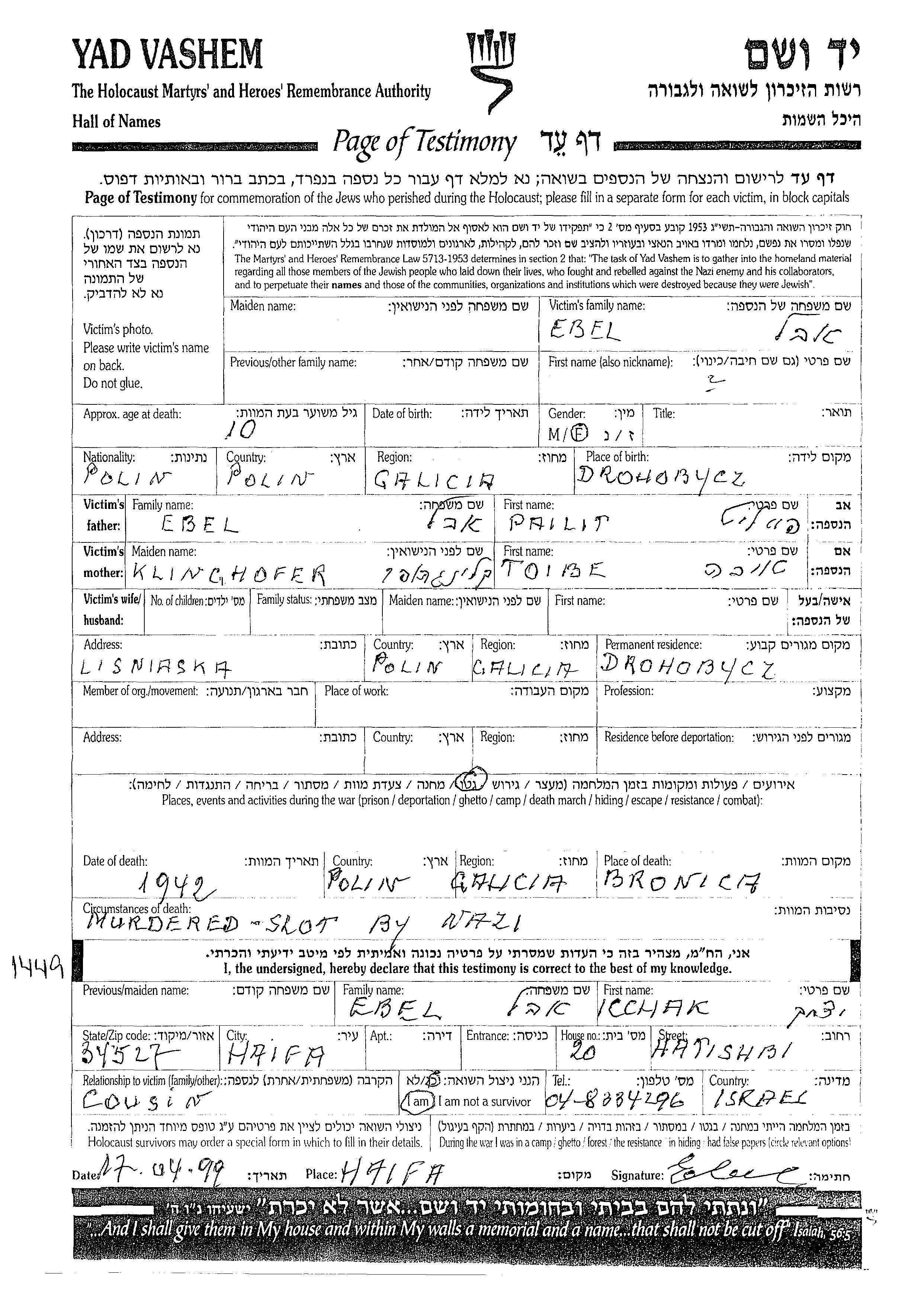 Vorname unbekannt Ebel wurde in Drohobycz, Polen geboren. Sie war die Tochter von Paltiel Pailit und Toibe, geb. Klinghofer. Sie war Kind. Vor dem Zweiten Weltkrieg lebte sie in Drohobycz, Polen. Während des Krieges war sie in Getto.