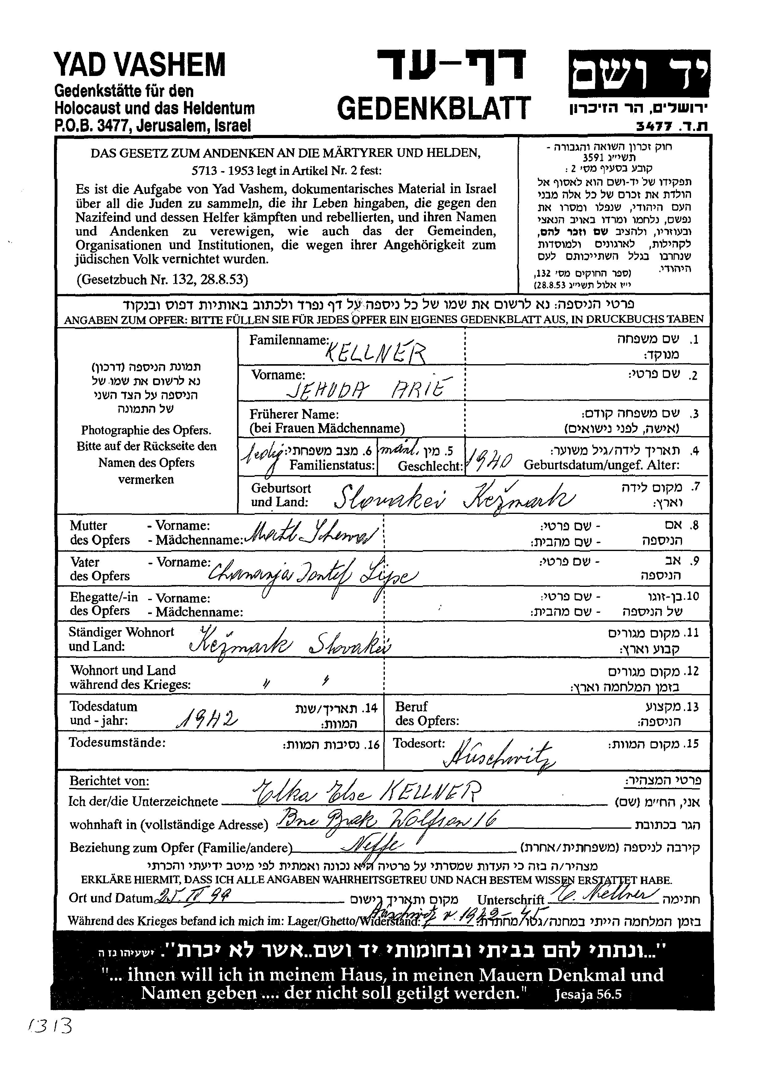 Kellner Arie Jehuda 1940 Kezmark, Tschechoslowakei Gedenkblatt