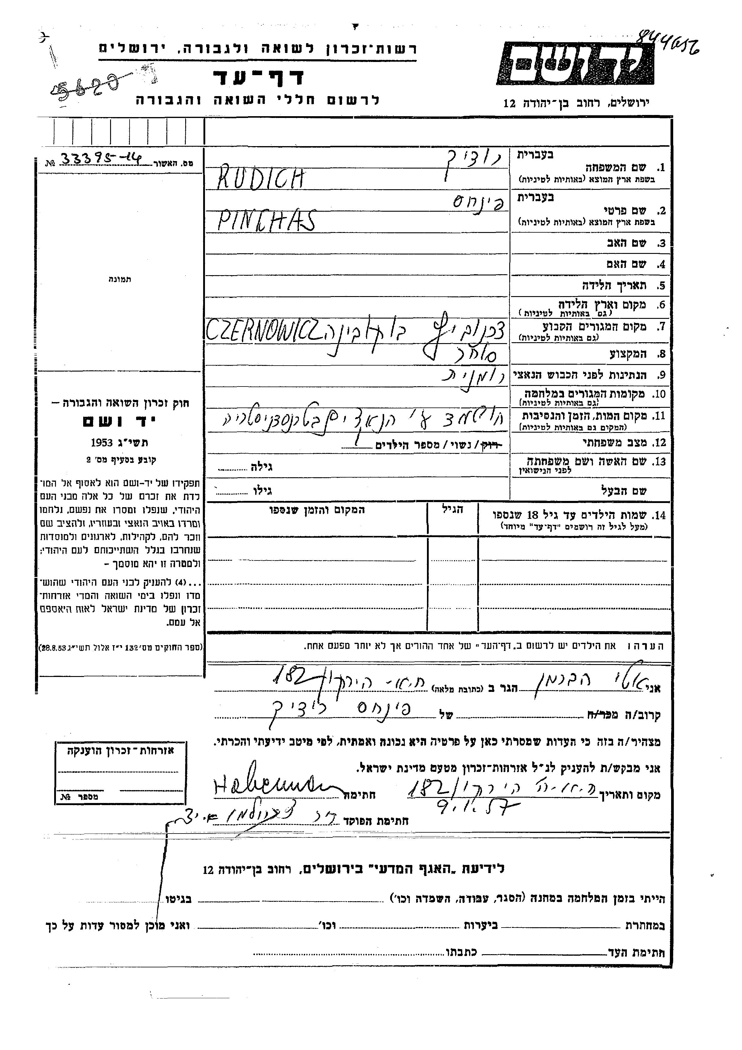 Pinchas Rudich. Er war Kaufmann/-frau. Vor dem Zweiten Weltkrieg lebte er in Czernowitz, Rumänien.