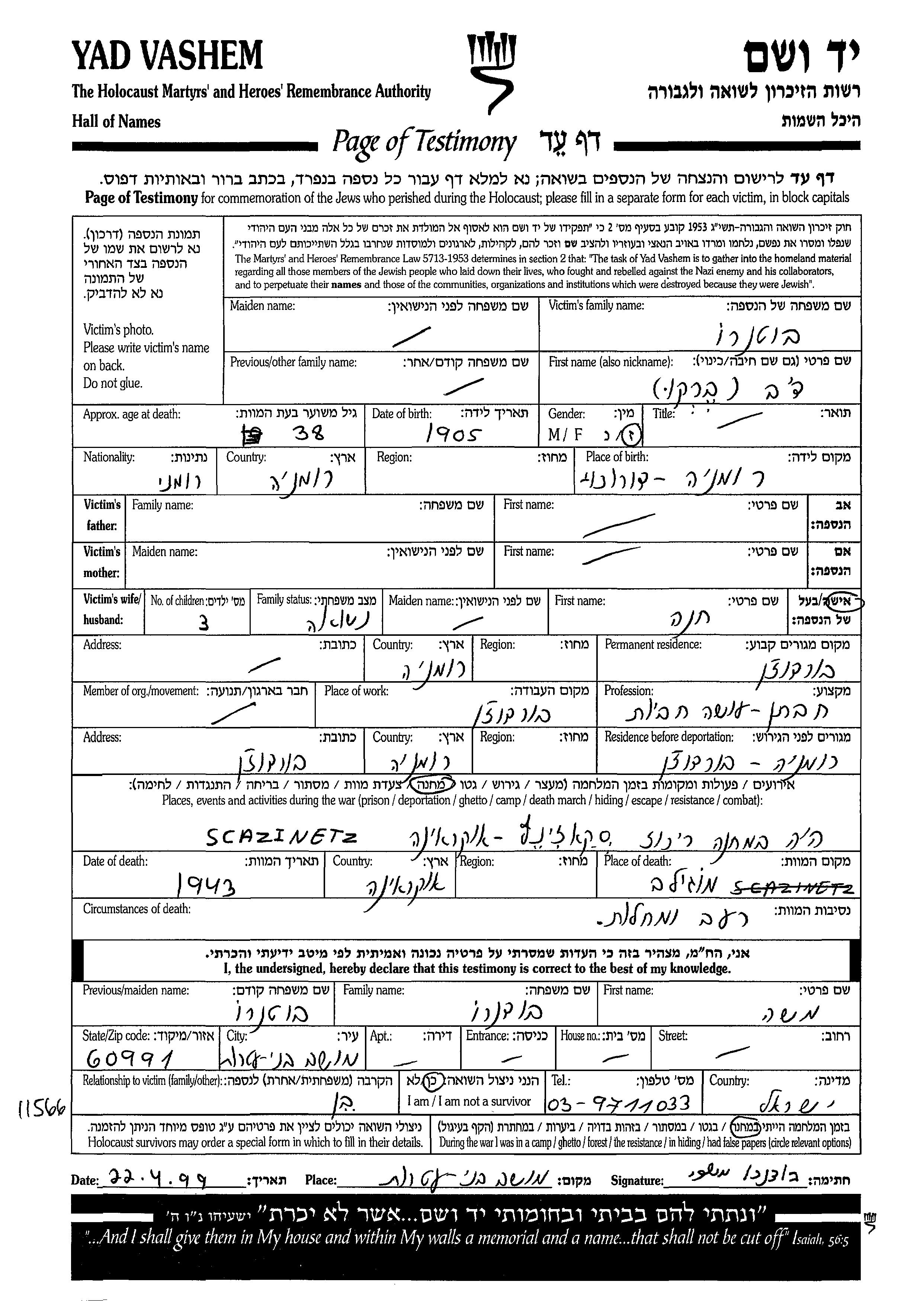 Butnaru Dov Berko 1905 Borduzen, Rumänien Gedenkblatt