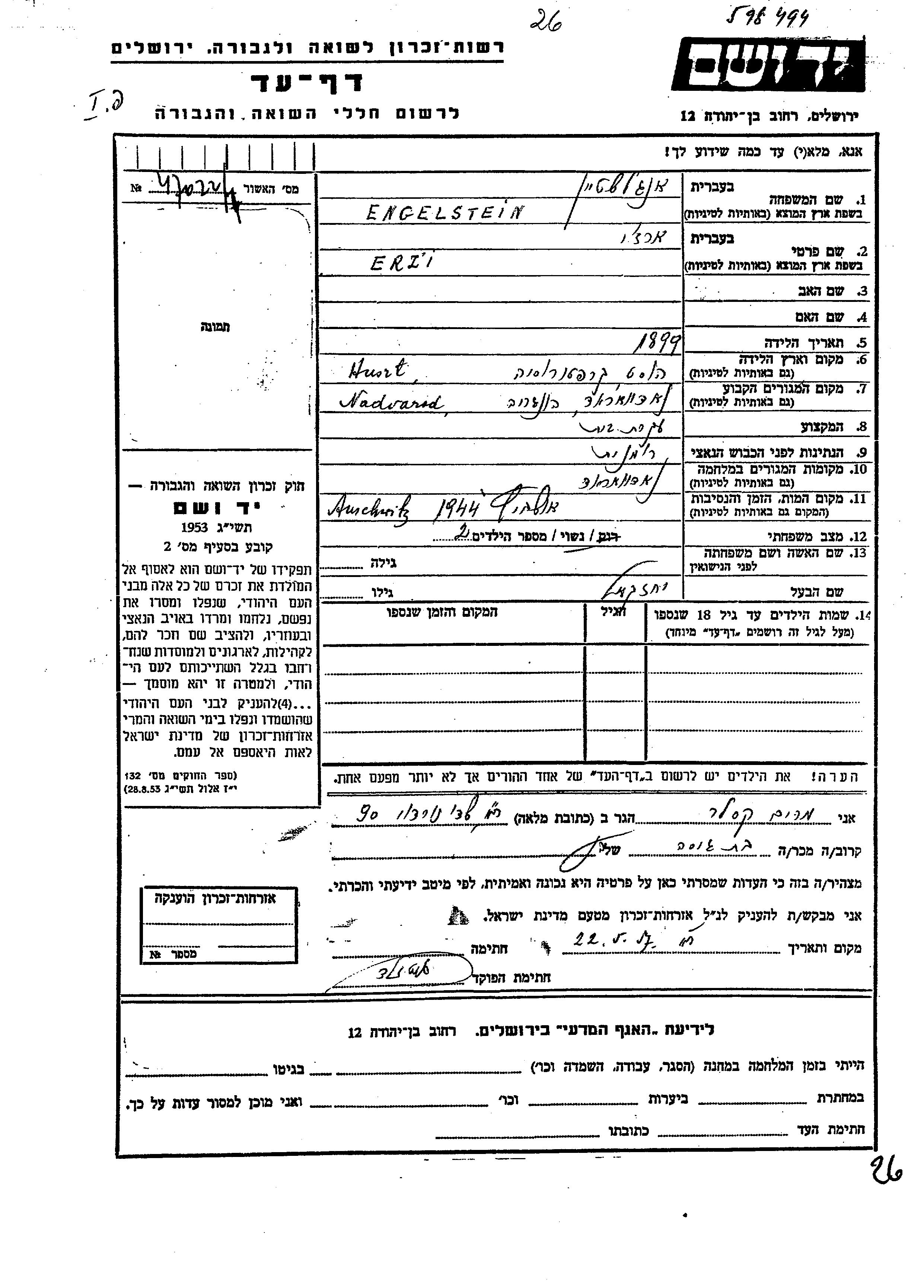 Erzi Aharon Engelstein wurde im Jahr 1899 in Hust, Tschechoslowakei geboren. Sie war Hausfrau und mit Yekhezkel Verheiratet. Vor dem Zweiten Weltkrieg lebte sie in Nagyvarad, Rumänien. Während des Krieges war sie in Nagyvarad, Rumänien.