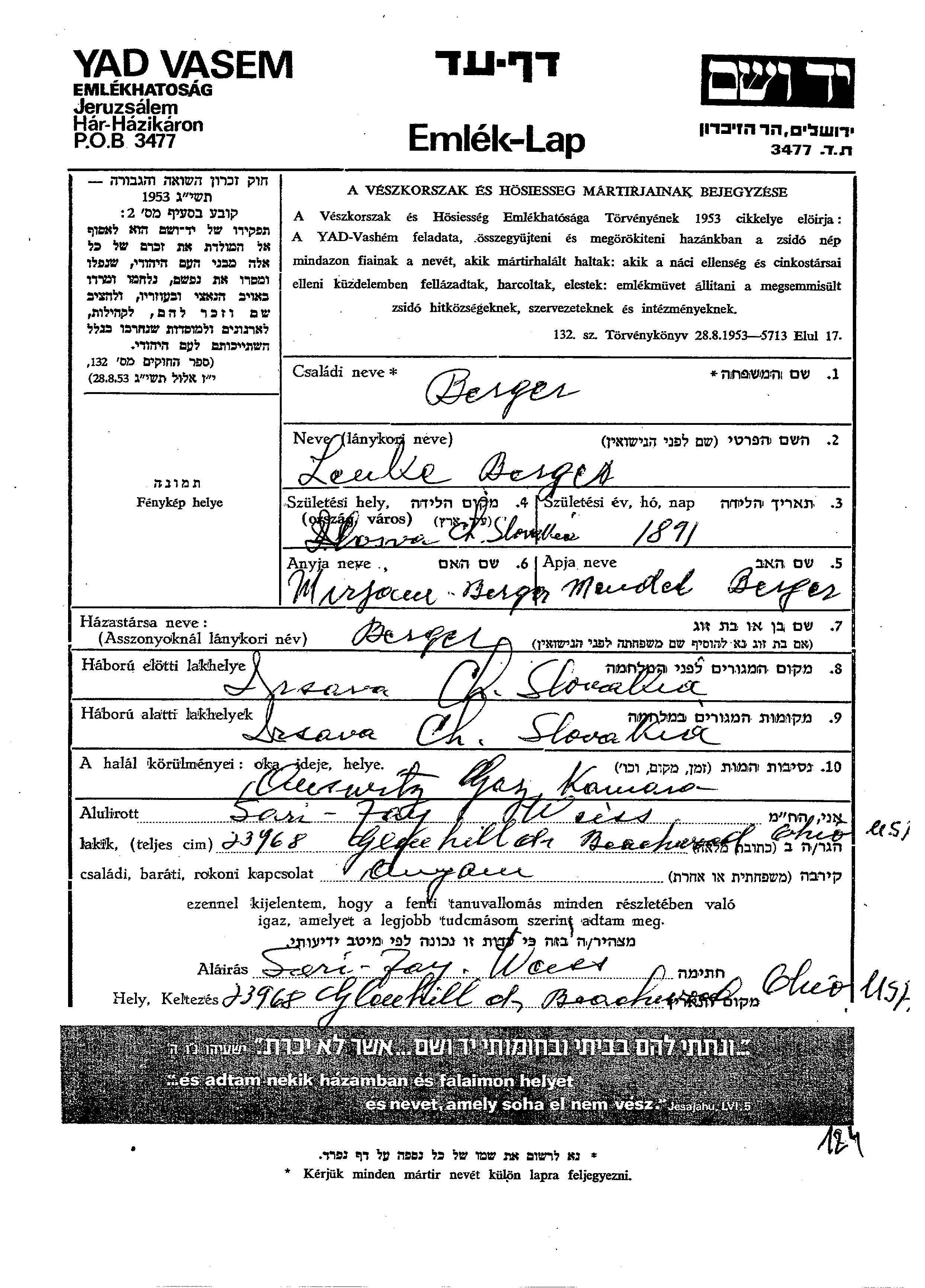 Lenke Berger, geb. Berger wurde im Jahr 1891 in Irsava, Tschechoslowakei geboren. Sie war die Tochter von Mendel und Mirjam. Vor dem Zweiten Weltkrieg lebte sie in Irsava, Tschechoslowakei. Während des Krieges war sie in Irsava, Tschechoslowakei.