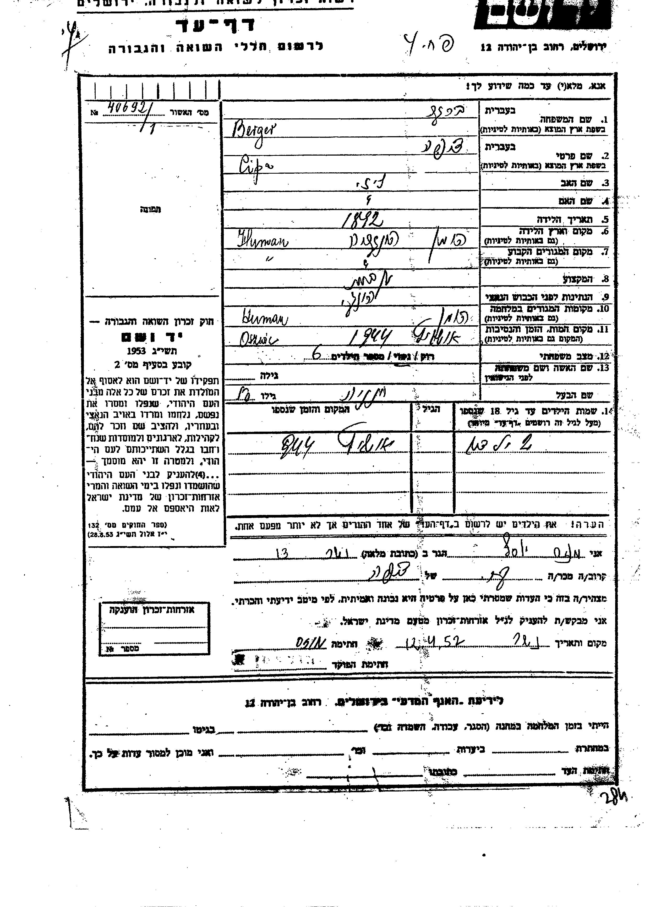 Cipa Berger wurde im Jahr 1892 in Human, Ukraine (UdSSR) geboren. Sie war Hausfrau und mit Khanania Verheiratet. Vor dem Zweiten Weltkrieg lebte sie in Human, Ukraine (UdSSR). Während des Krieges war sie in Human, Ukraine (UdSSR).
