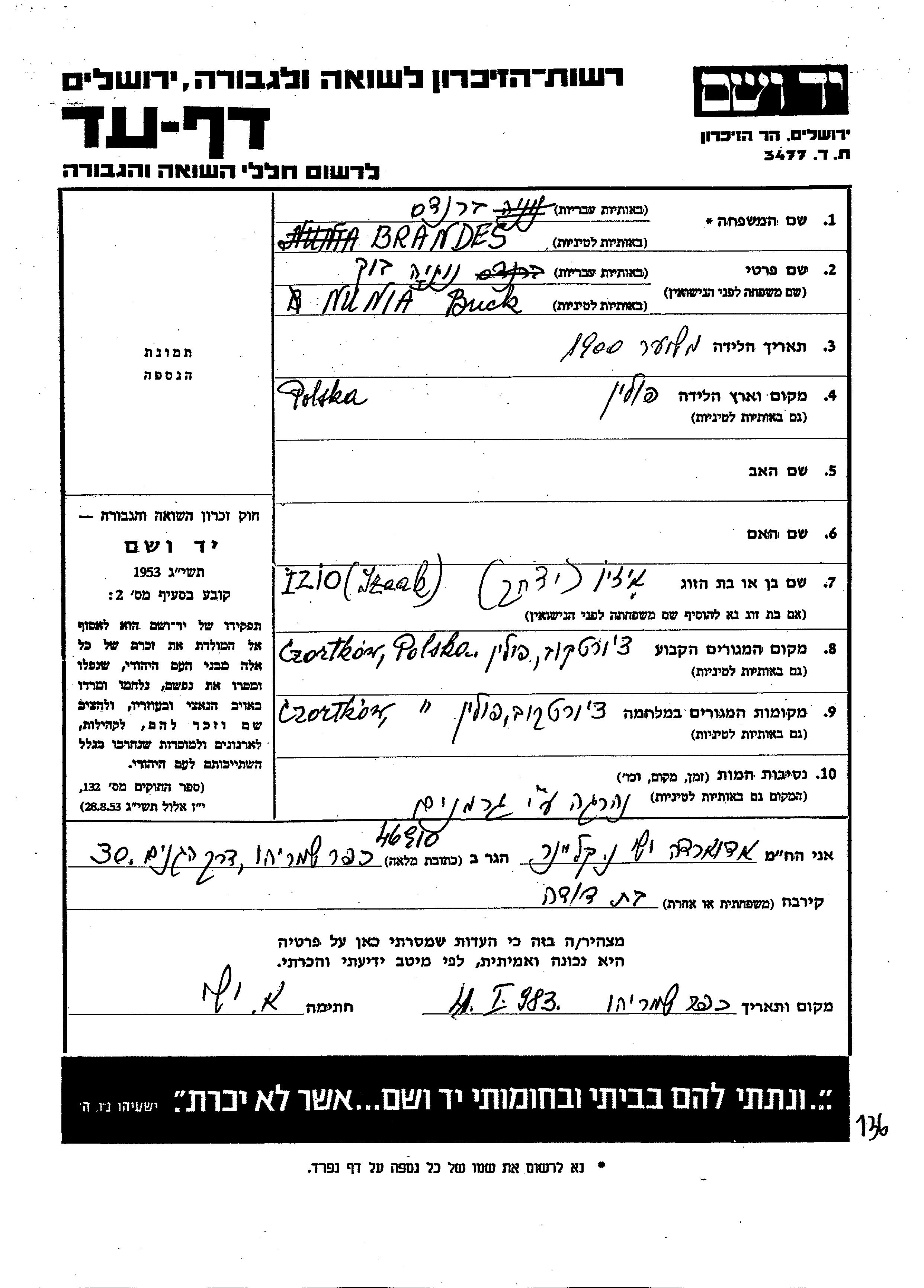 Natan Brandes, geb. Buck wurde im Jahr 1900 in Polen geboren. Vor dem Zweiten Weltkrieg lebte sie in Czortkow, Polen. Während des Krieges war sie in Czortkow, Polen.