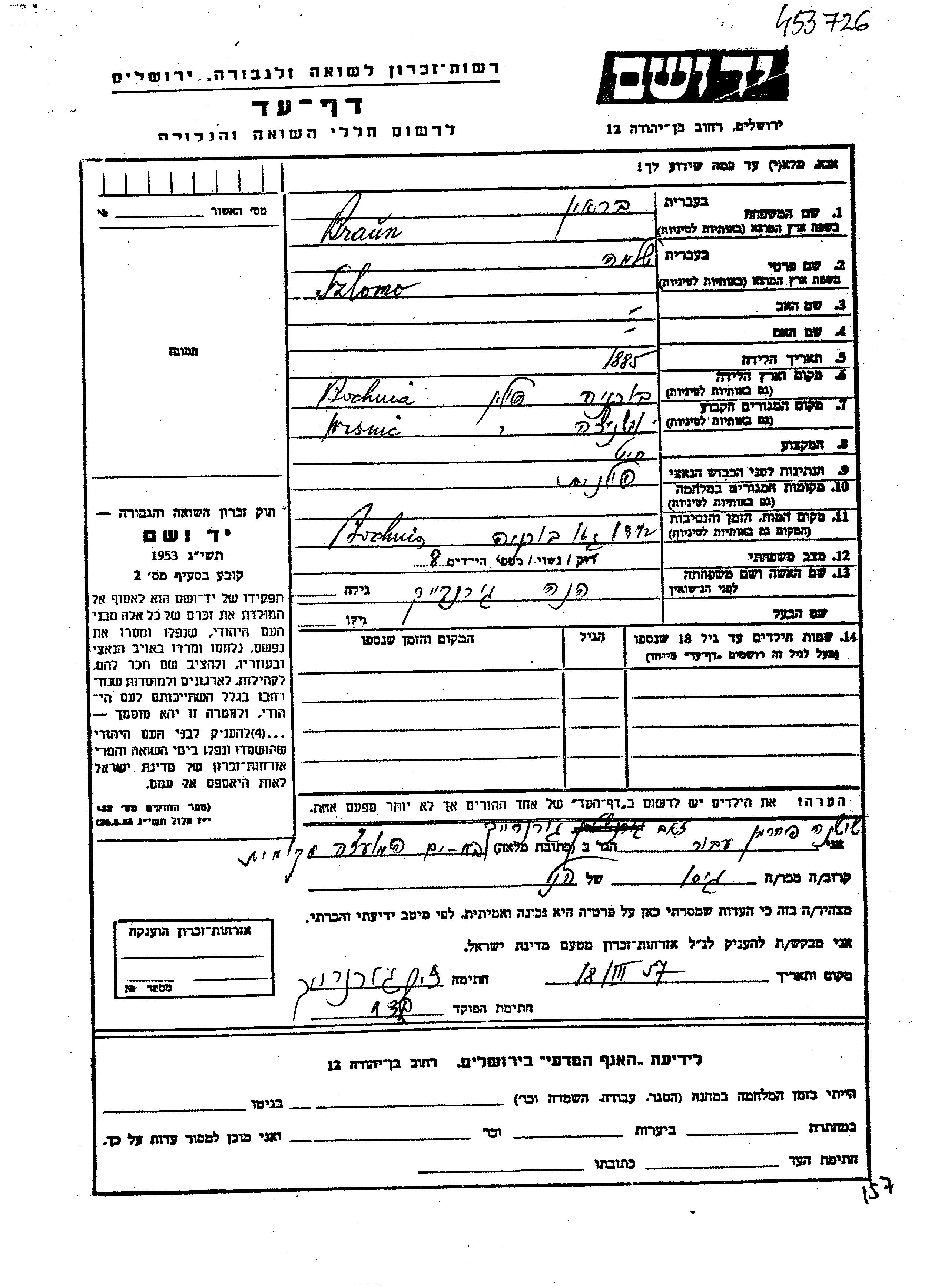 Szlomo Braun wurde im Jahr 1885 in Bochnia, Polen geboren. Er war Schneider und mit Hena, geb. Girnreuch Verheiratet. Vor dem Zweiten Weltkrieg lebte er in Warszawa, Polen.