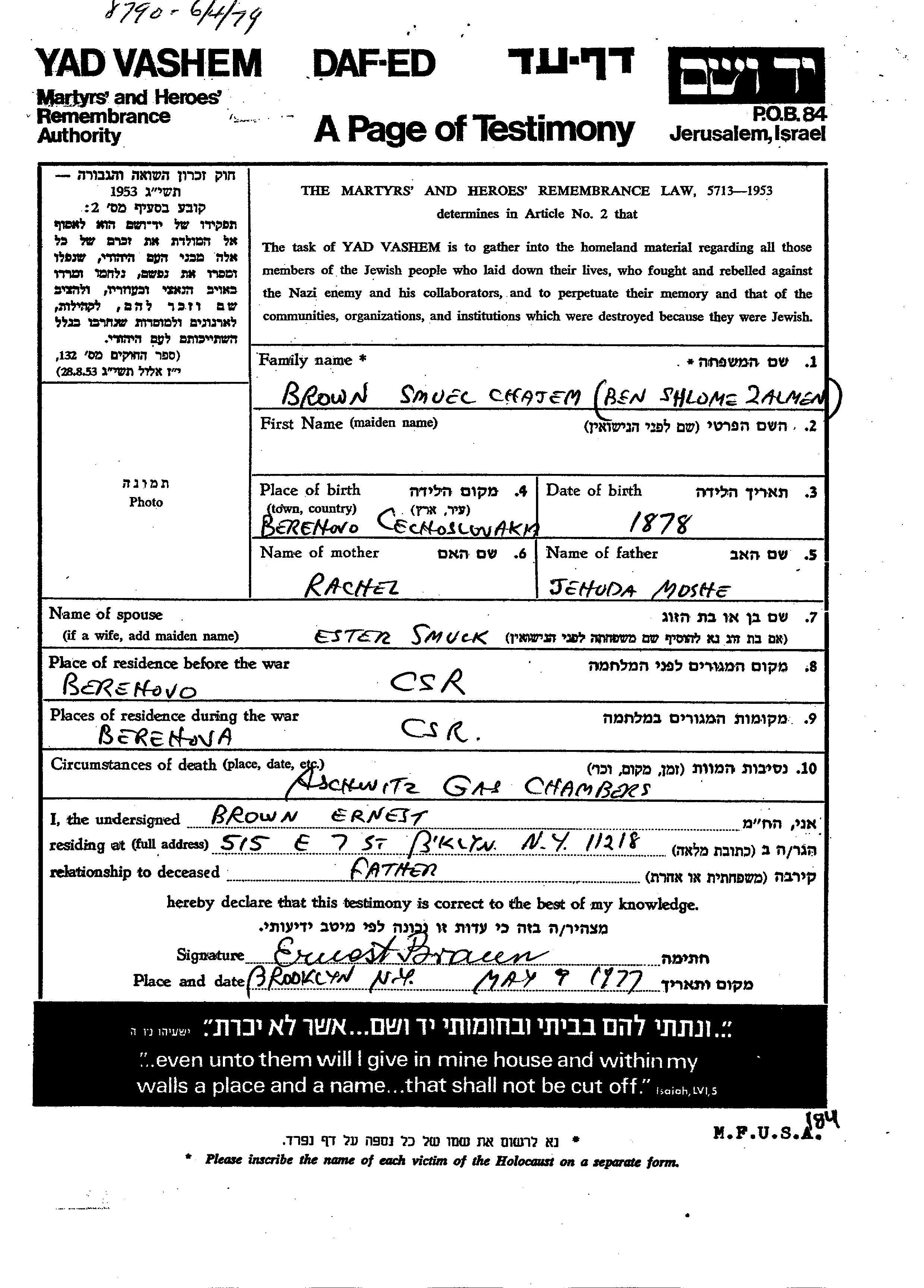 Smuel Chajem Brown wurde im Jahr 1878 in Berehovo, Tschechoslowakei geboren. Er war der Sohn von Jehuda Moshe und Rachel. Er war mit Ester, geb. Smuck Verheiratet. Vor dem Zweiten Weltkrieg lebte er in Tschechoslowakei. Während des Krieges war er in Tschechoslowakei.