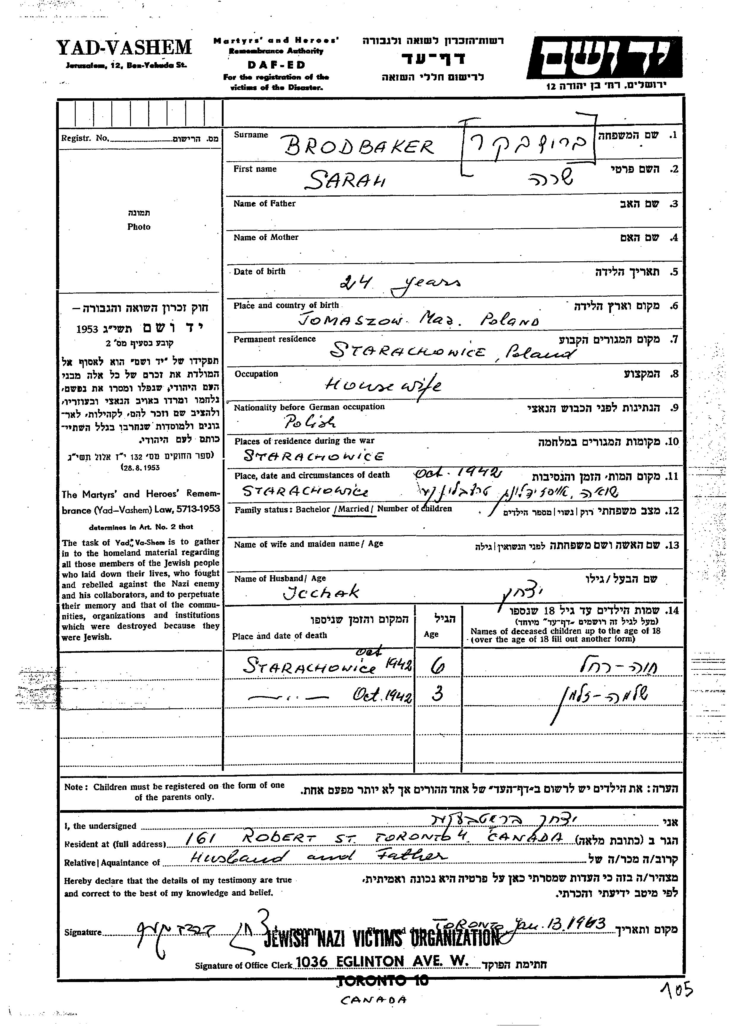 Sara Brodbaker wurde in Tomaszow Mazowiecki, Polen geboren. Sie war Hausfrau und mit Icchak Verheiratet. Vor dem Zweiten Weltkrieg lebte sie in Starachowice, Polen. Während des Krieges war sie in Starachowice, Polen.