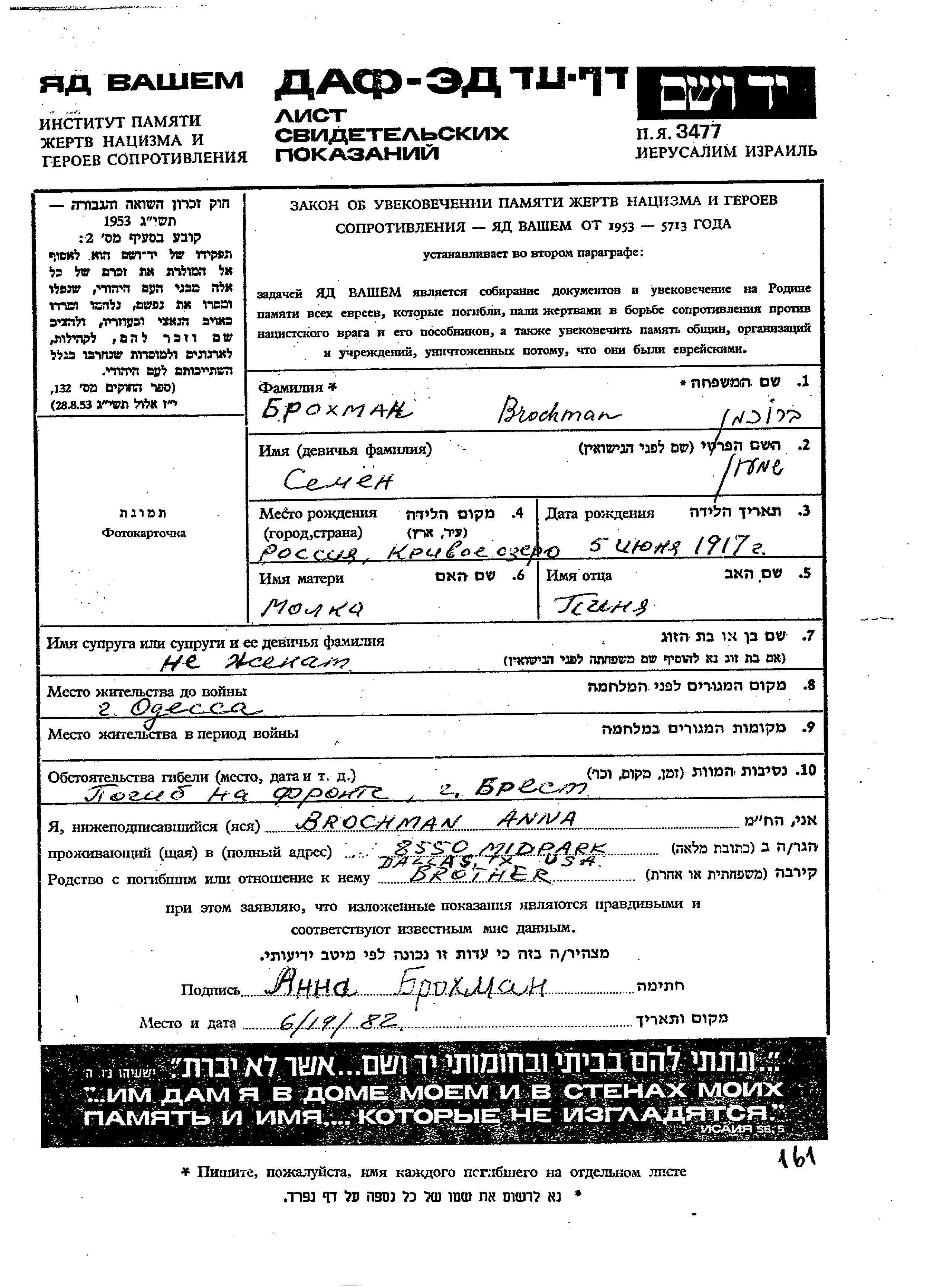 Brochman Shimon 1917 Odessa, Ukraine (UdSSR) Gedenkblatt