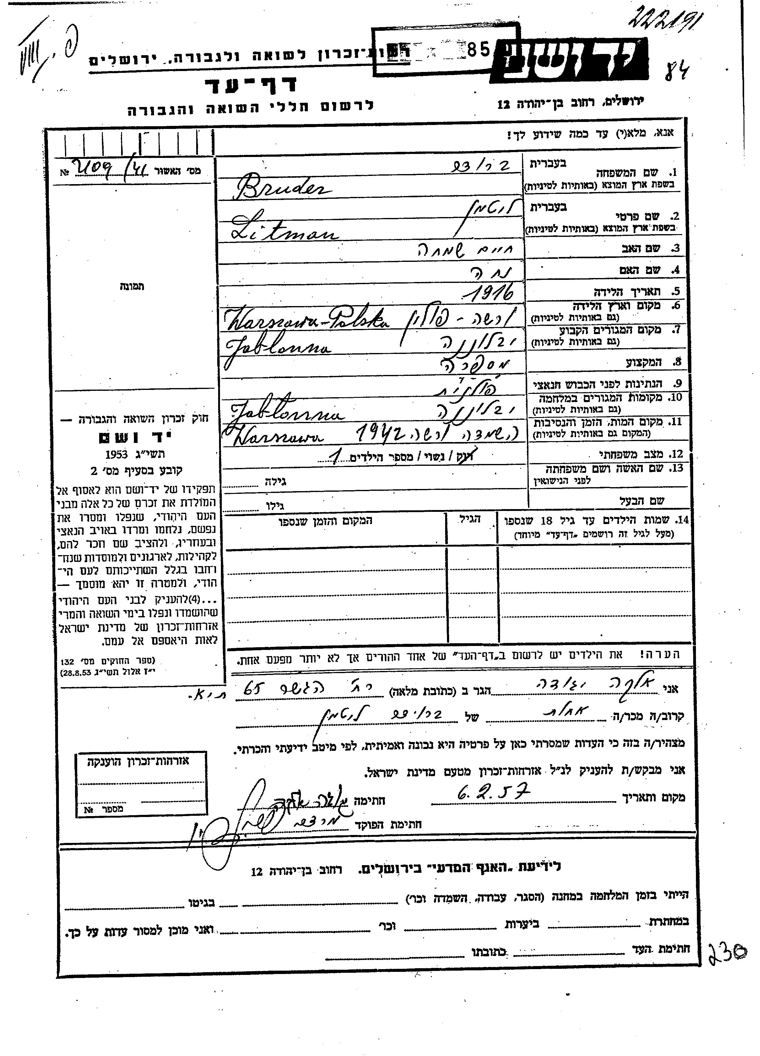 Litman wurde in der Schoah ermordet. Todesort: Warsaw, Polen im Jahr 1942.