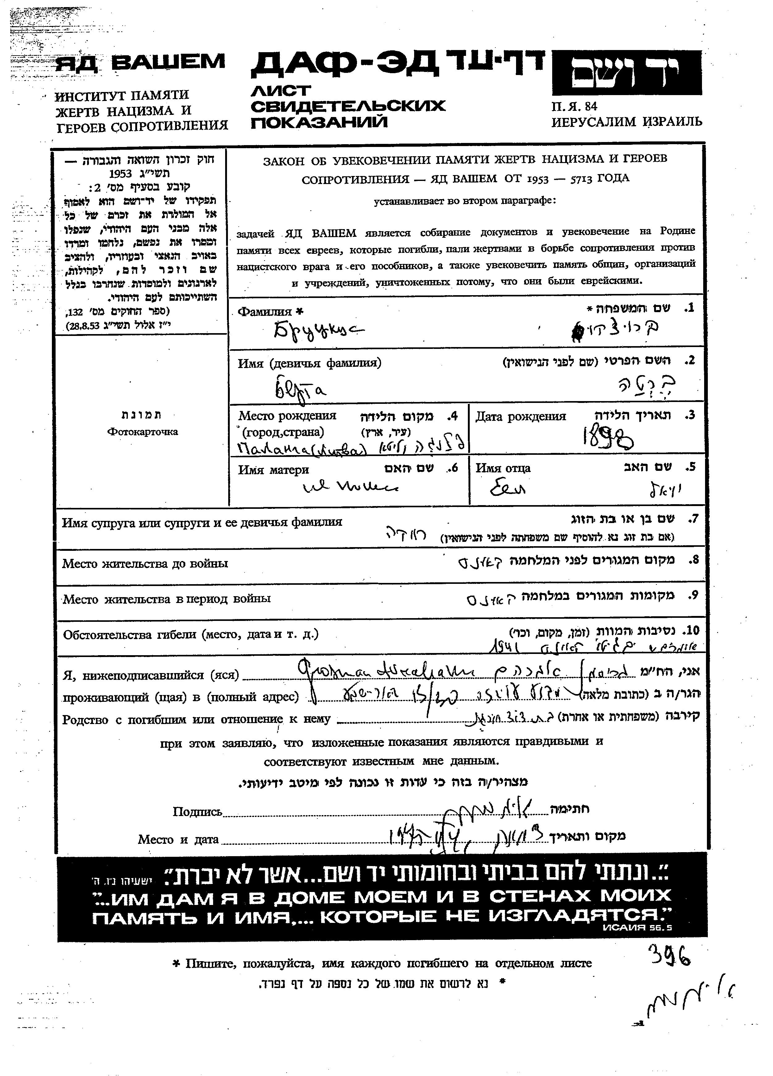 Berta Brutzkus wurde im Jahr 1898 in Palanga, Litauen geboren. Sie war die Tochter von Yoel. Sie war Ledig. Vor dem Zweiten Weltkrieg lebte sie in Kaunas, Litauen. Während des Krieges war sie in Kaunas, Litauen.