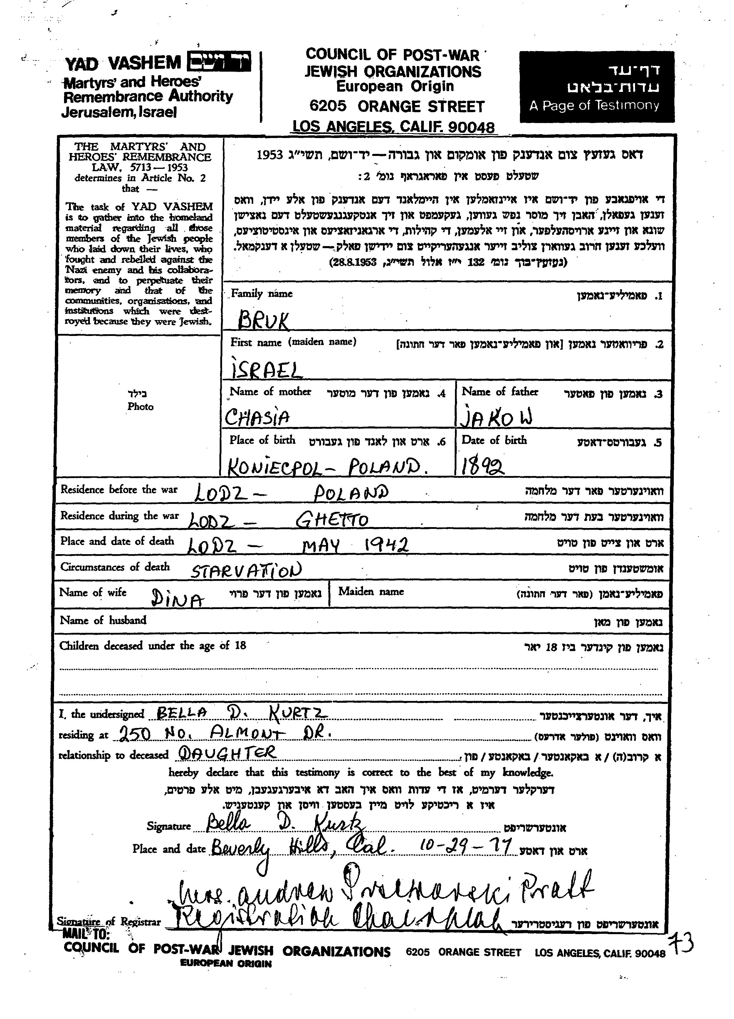 Israel Bruk wurde im Jahr 1892 in Koniecpol, Polen geboren. Er war der Sohn von Jakow und Chasia. Vor dem Zweiten Weltkrieg lebte er in Lodz, Polen. Während des Krieges war er in Lodz, Polen.