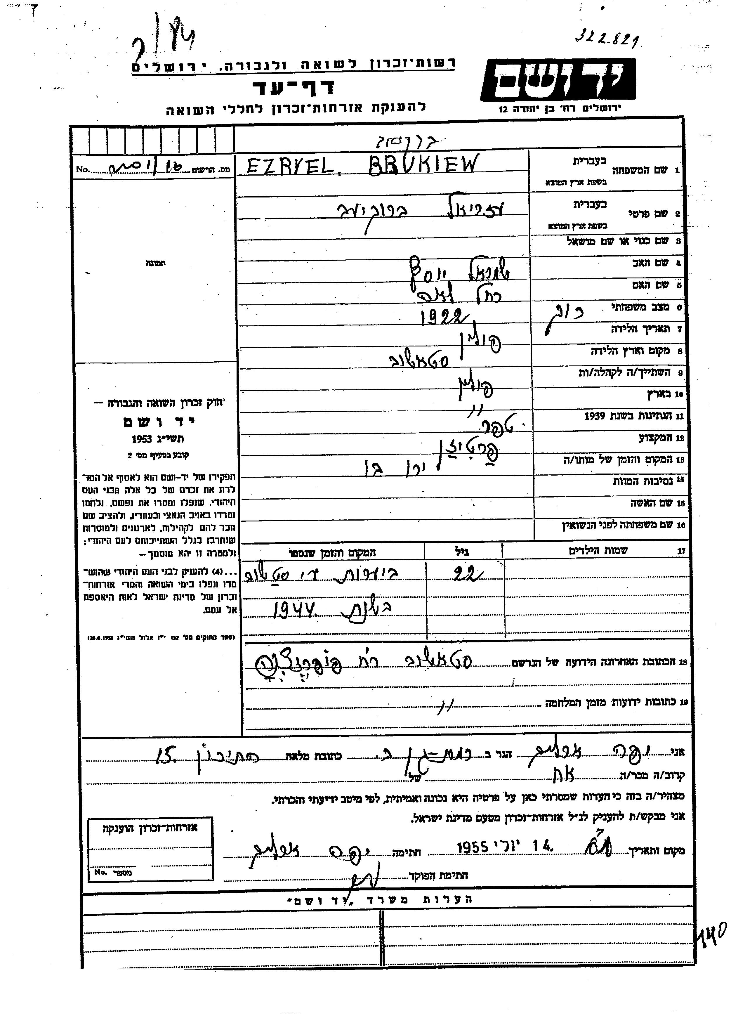 Ezriel Brukiew wurde im Jahr 1922 in Stasov, Polen geboren. Er war der Sohn von Shmuel Yosef und Lea Rakhel. Vor dem Zweiten Weltkrieg lebte er in Polen. Während des Krieges war er in Stasov, Polen.