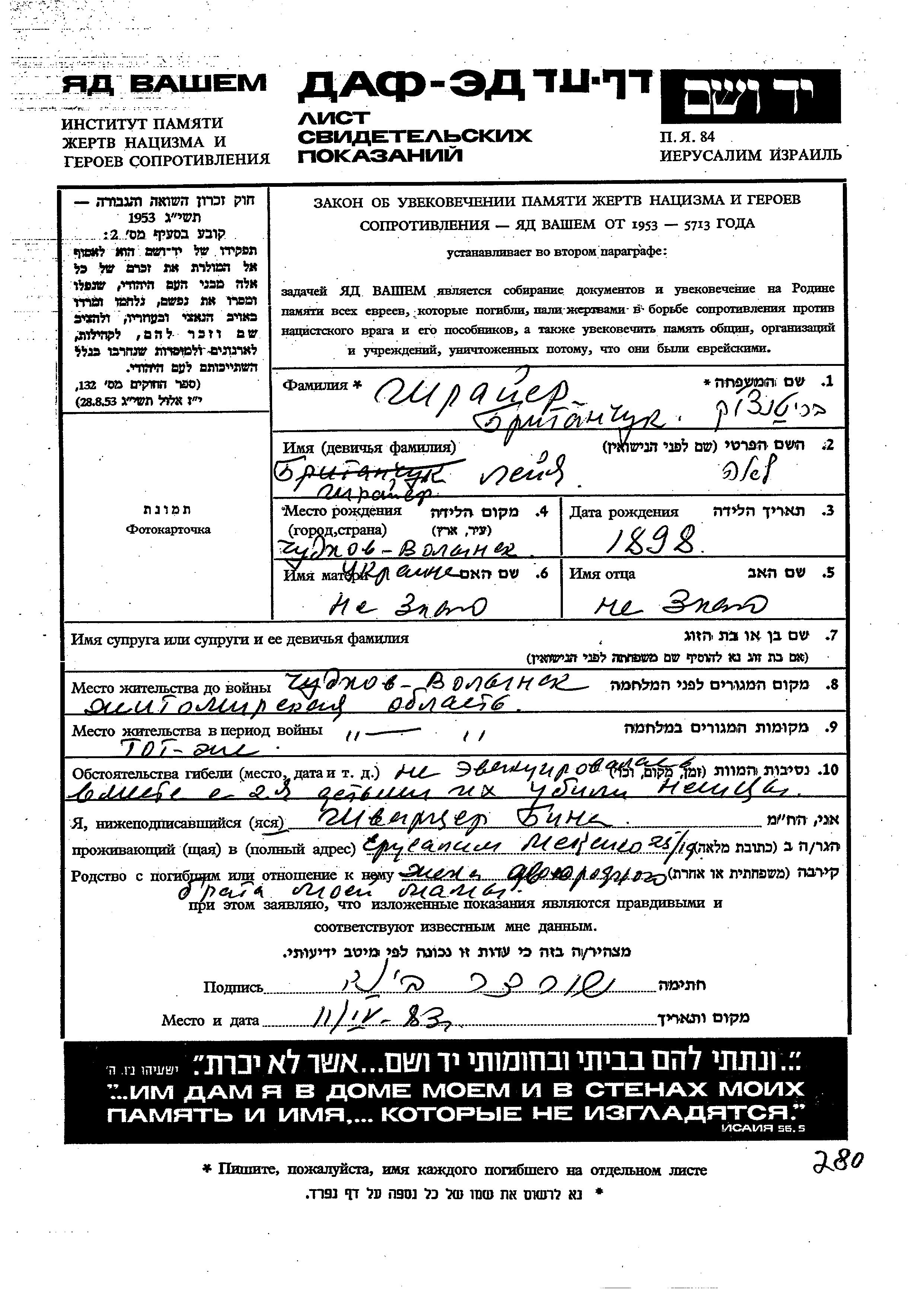 Lea Britanchuk, geb. Shreier wurde im Jahr 1898 geboren. Sie war Verheiratet. Vor dem Zweiten Weltkrieg lebte sie in Chudnov, Ukraine (UdSSR). Während des Krieges war sie in Chudnov, Ukraine (UdSSR).