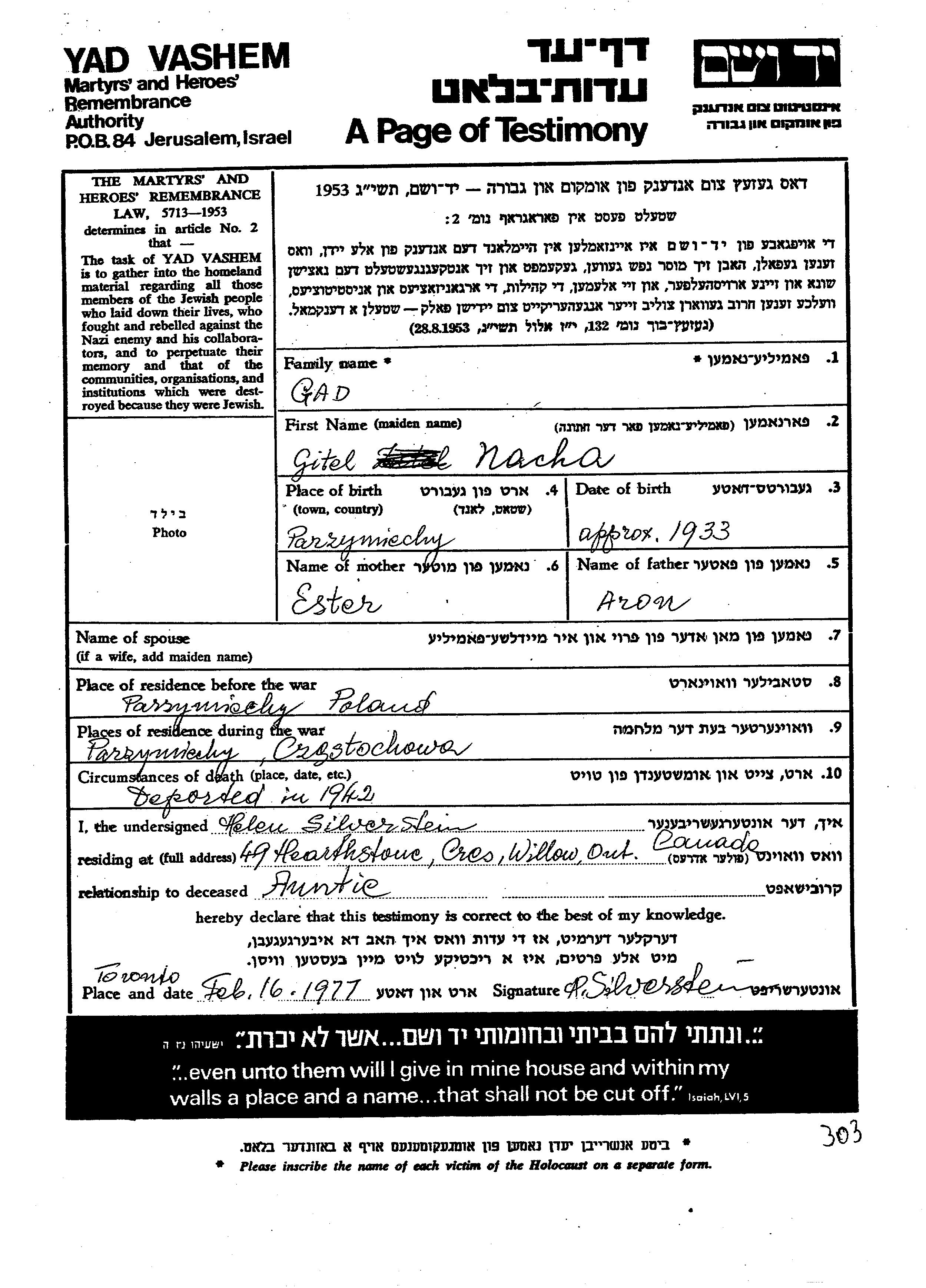 Gitel Nacha Gad wurde im Jahr 1933 in Parzymiechy, Polen geboren. Sie war die Tochter von Aron und Ester. Sie war Kind. Vor dem Zweiten Weltkrieg lebte sie in Parzymiechy, Polen. Während des Krieges war sie in Parzymiechy, Polen.
