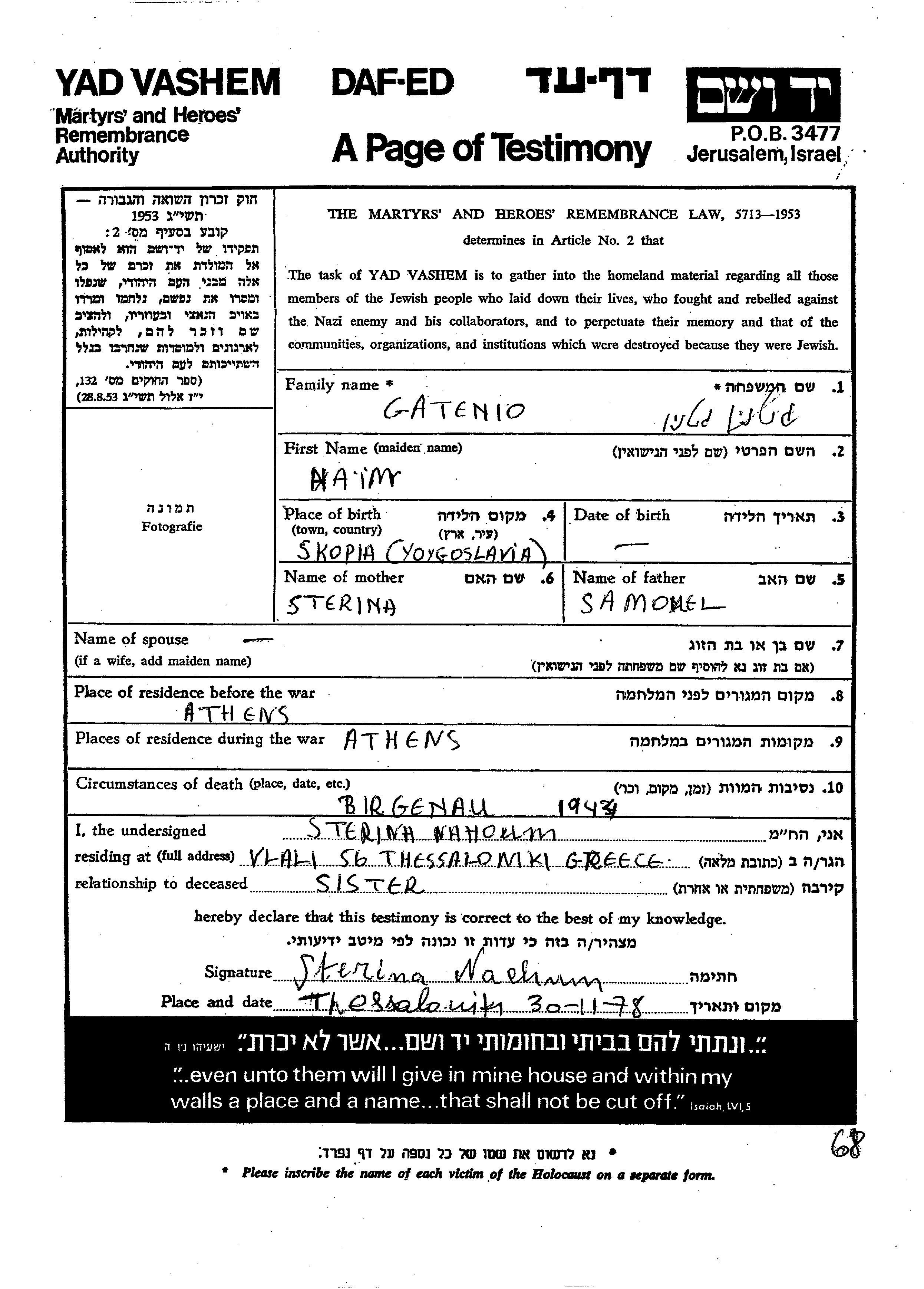 Gatenio Haim Athens, Griechenland Gedenkblatt