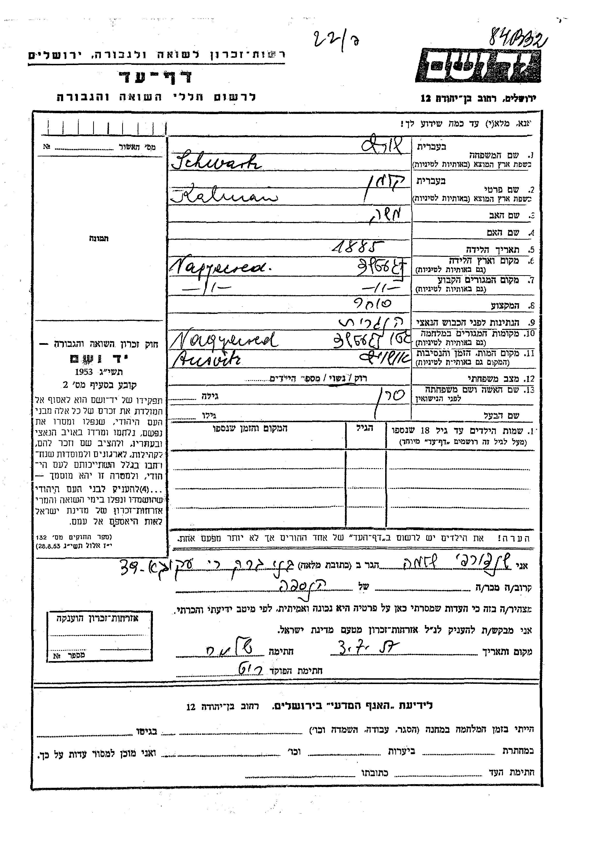 Kalman Schwartz wurde im Jahr 1885 in Nagyecsed, Ungarn geboren. Er war der Sohn von Moshe. Er war Kaufmann/-frau und mit Seren Verheiratet. Vor dem Zweiten Weltkrieg lebte er in Nagyecsed, Ungarn. Während des Krieges war er in Nagyecsed, Ungarn.