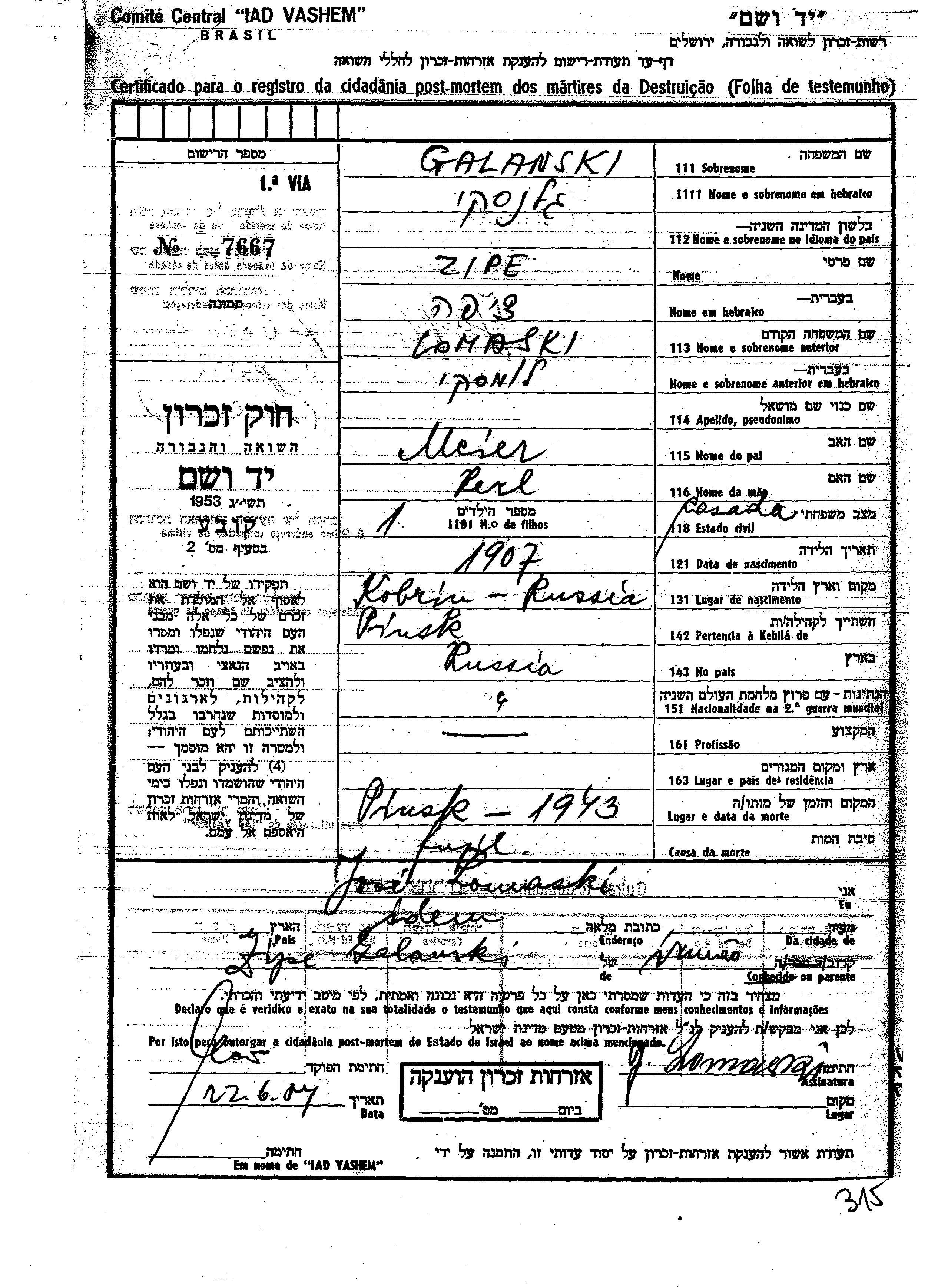 Zipe Galanski, geb. Lomaski wurde im Jahr 1907 in Kobryn, Polen geboren. Sie war die Tochter von Meier und Perl. Sie war Verheiratet. Vor dem Zweiten Weltkrieg lebte sie in Pinsk, Polen.
