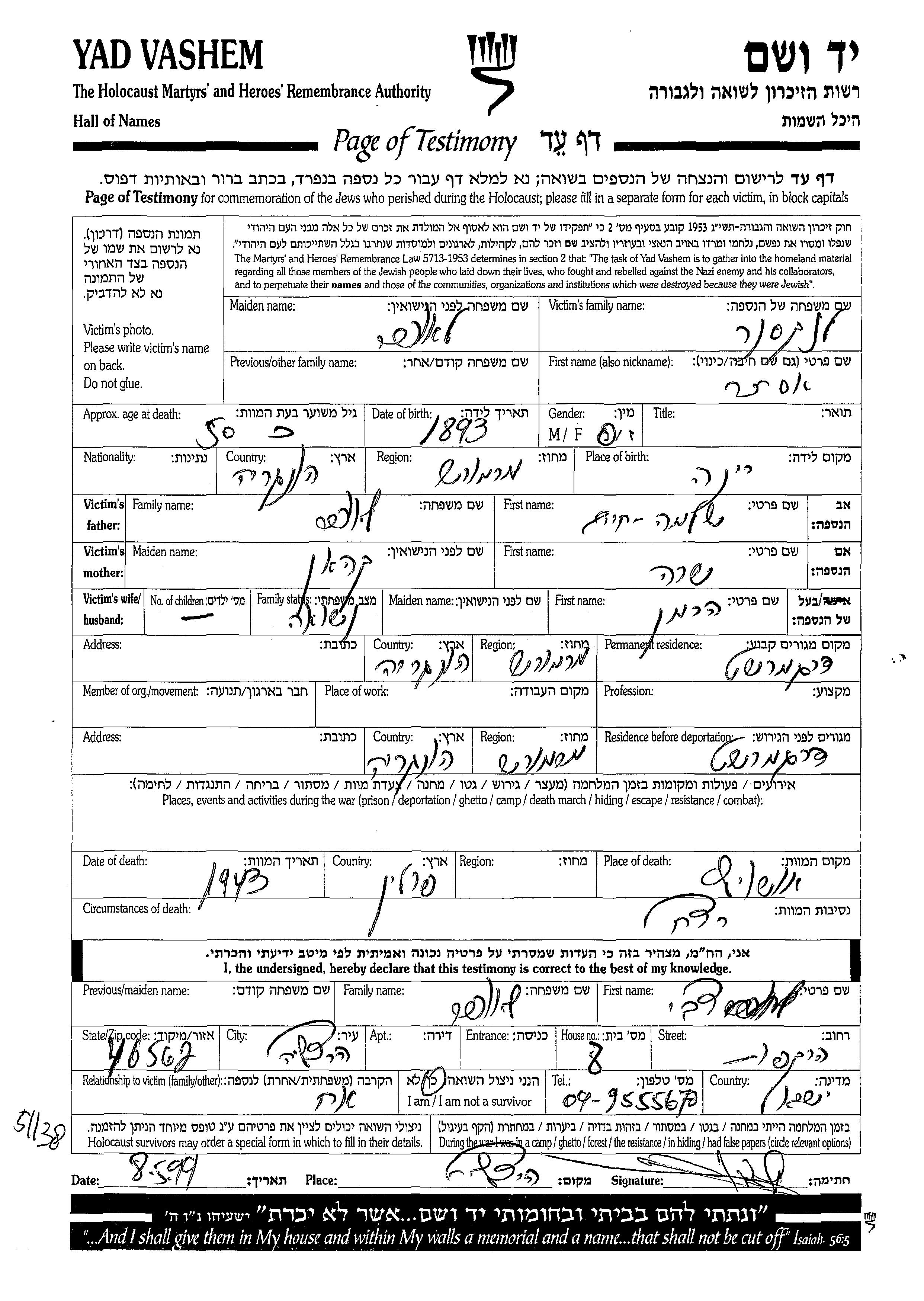 Ester Lanksner, geb. Laufer wurde im Jahr 1893 in Rina, Rumänien geboren. Sie war die Tochter von Shlomo Khaim und Sara, geb. Kohen. Sie war mit Herman Verheiratet. Vor dem Zweiten Weltkrieg lebte sie in Dergomereszt, Rumänien. Während des Krieges war sie in Dergomereszt, Rumänien.