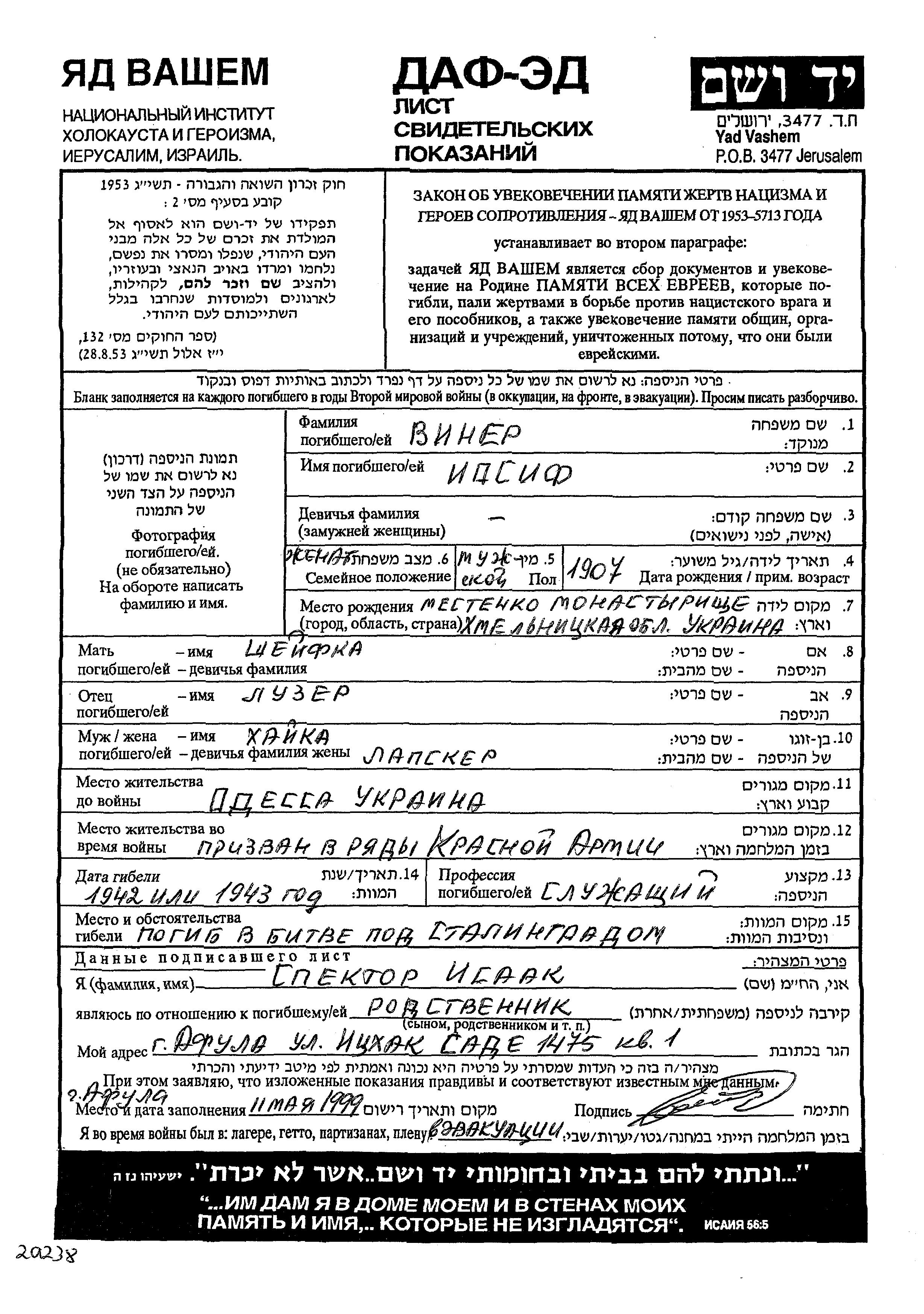 Iosif Viner wurde im Jahr 1907 in Monastyrishche, Ukraine (UdSSR) geboren. Er war der Sohn von Luzer und Sheifka. Er war Angestellte/-r und mit Khaika, geb. Lapsker Verheiratet. Vor dem Zweiten Weltkrieg lebte er in Odessa, Ukraine (UdSSR). Während des Krieges war er in die Sowjetischen Streitkräfte.