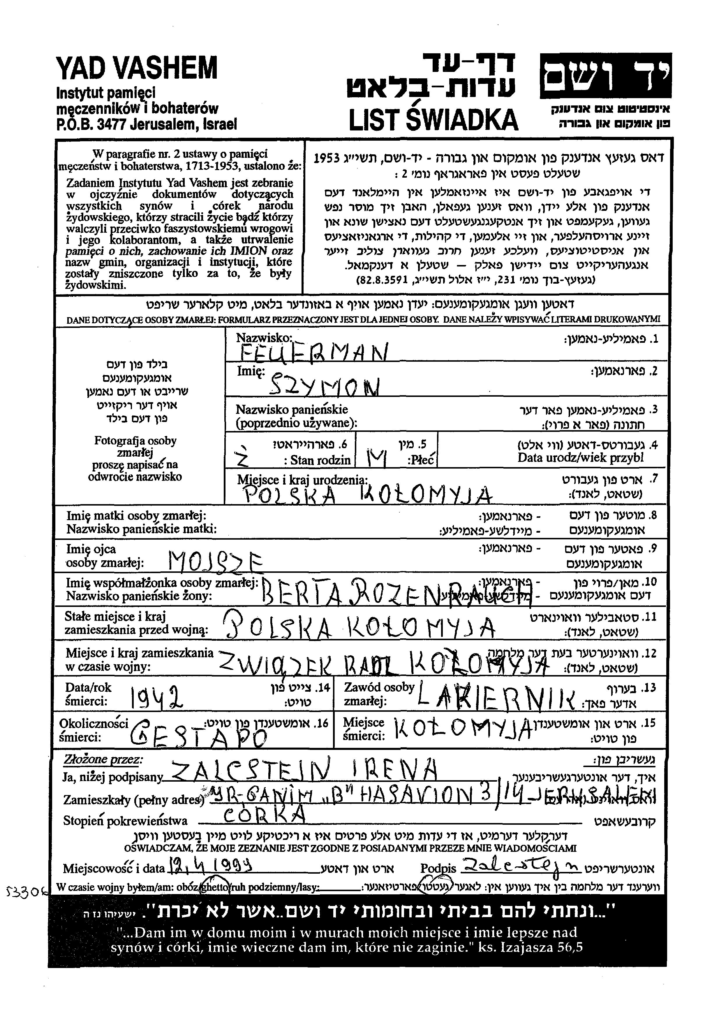 Szymon Feuerman wurde in Kolomyja, Polen geboren. Er war der Sohn von Mojsze. Er war Lackierer und mit Berta, geb. Rozenrauch Verheiratet. Vor dem Zweiten Weltkrieg lebte er in Kolomyja, Polen. Während des Krieges war er in Kolomyja, Polen.