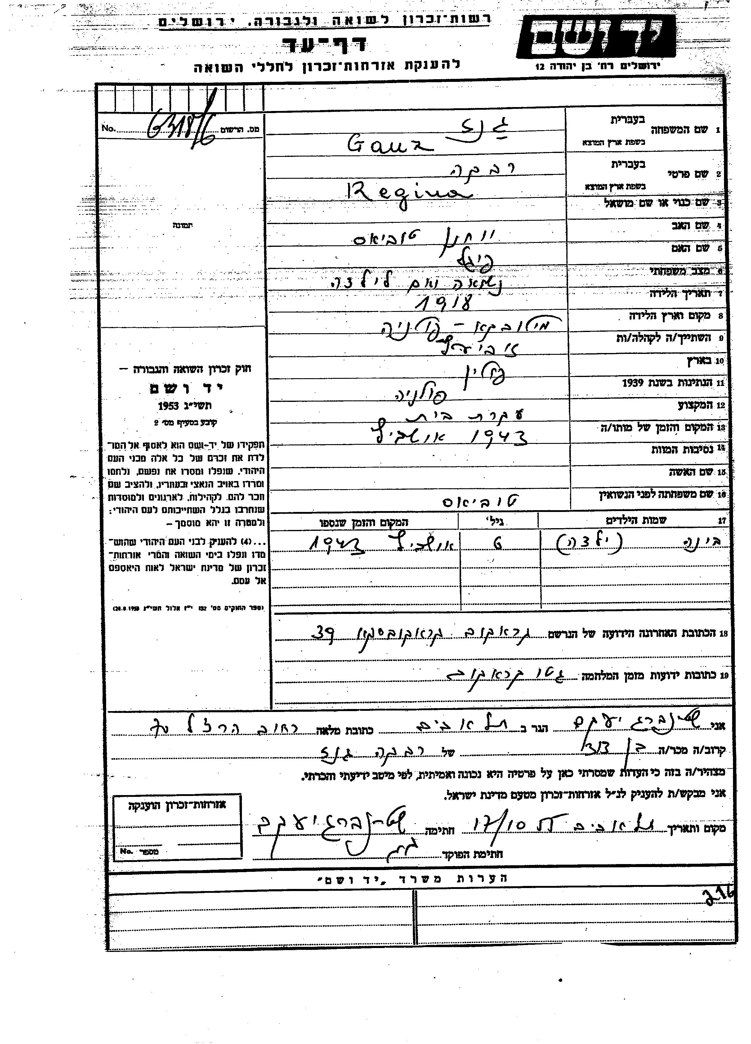 Rivka Regina wurde in der Schoah ermordet. Todesort: Auschwitz, Polen im Jahr 1943.