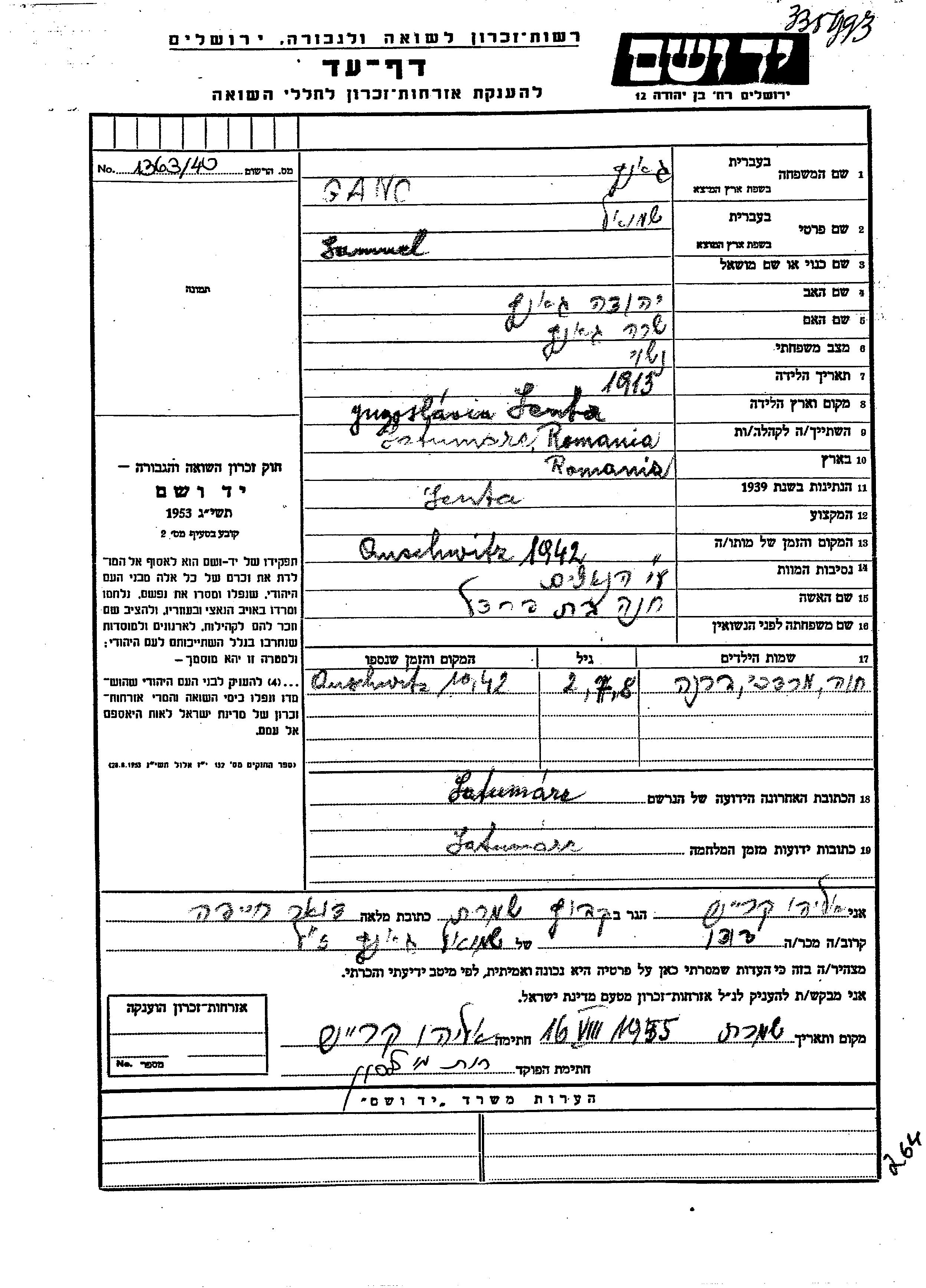 Samuel wurde in der Schoah ermordet. Todesort: Auschwitz, Polen im Jahr 1942.
