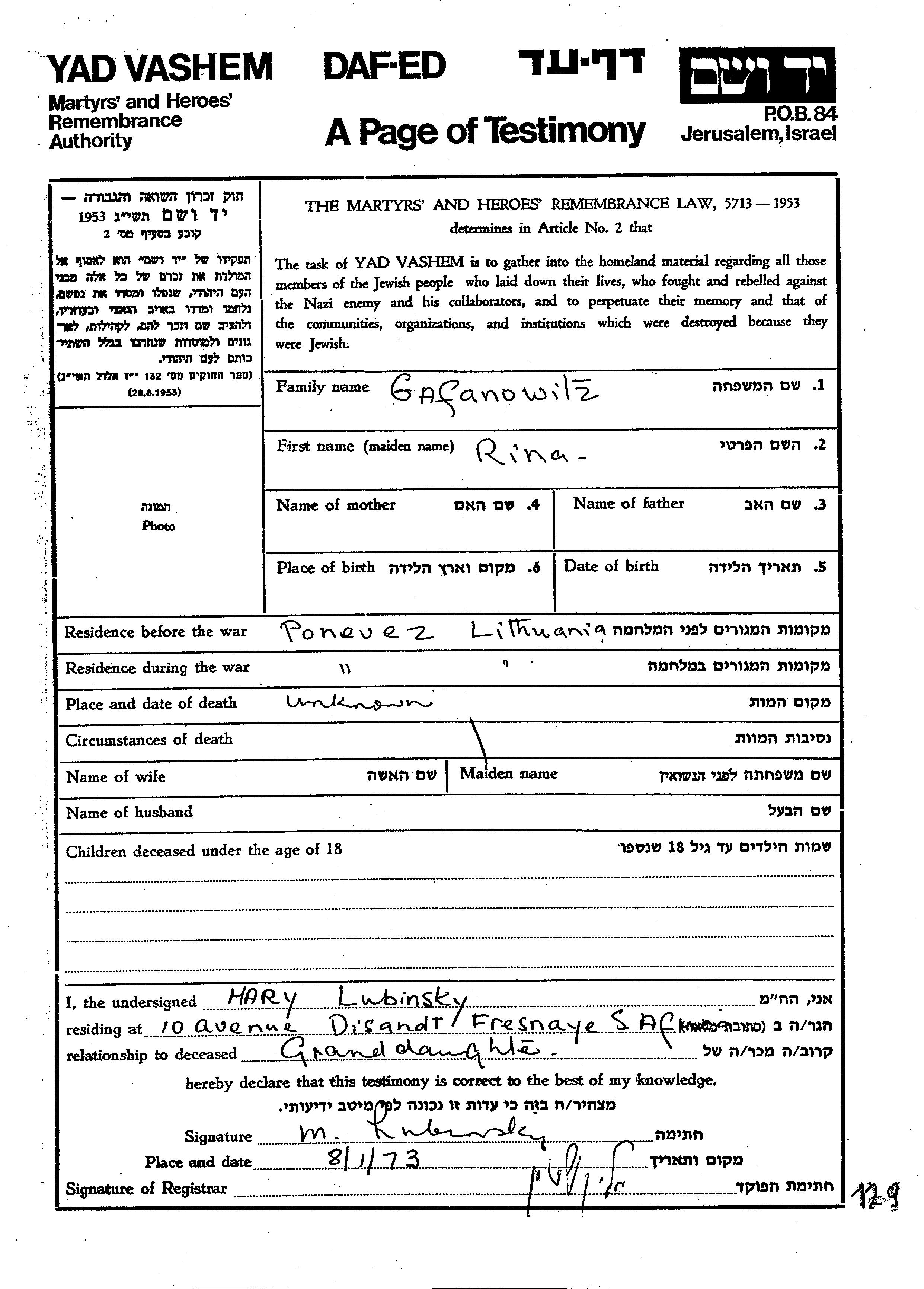Rina Gafanowitz. Vor dem Zweiten Weltkrieg lebte sie in Ponevezh, Litauen. Während des Krieges war sie in Ponevezh, Litauen.