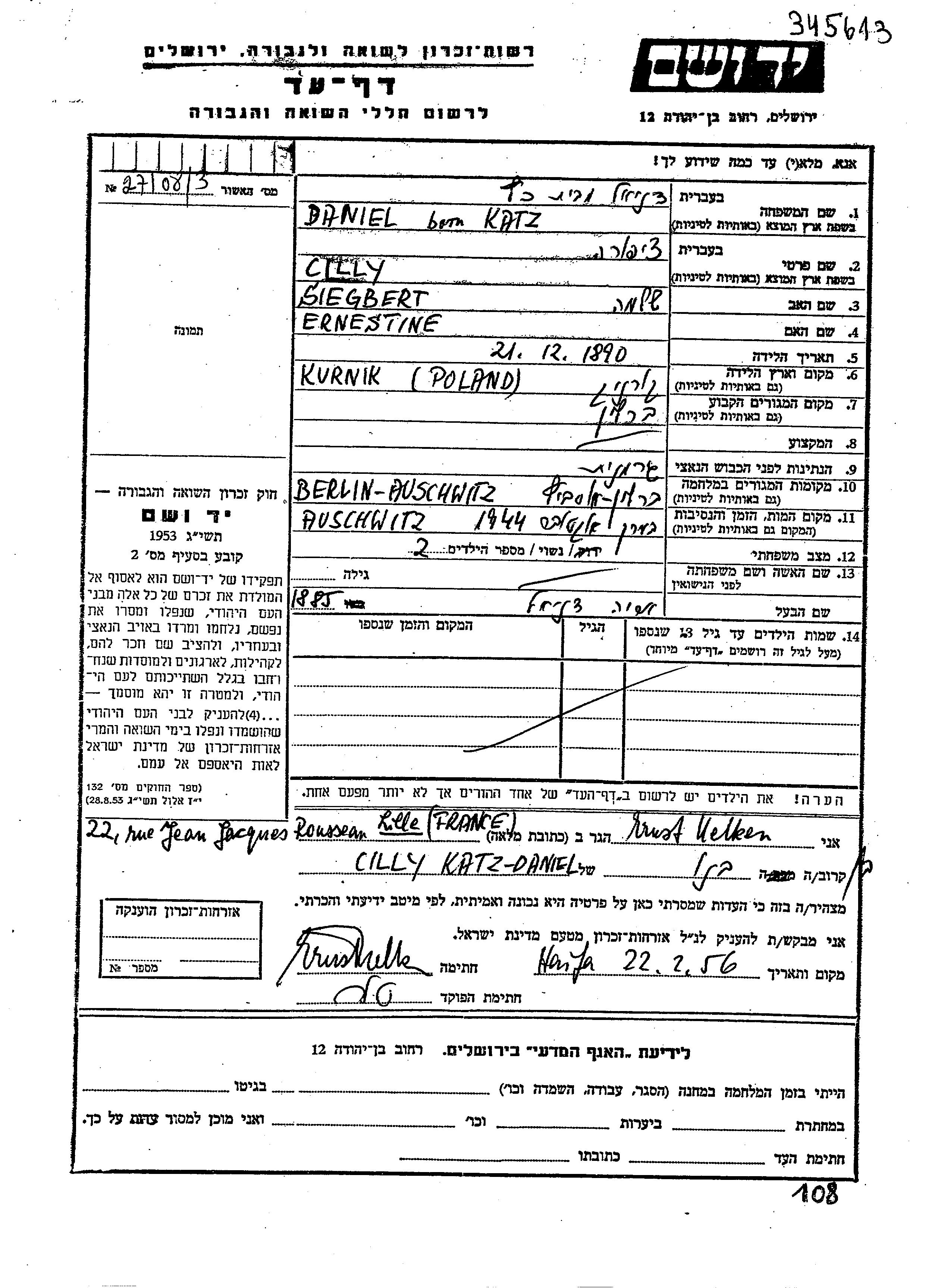 Tzipora Cilly Daniel, geb. Katz wurde im Jahr 1890 in Kurnik, Polen geboren. Sie war die Tochter von Siegbert Shlomo und Ernestine. Sie war mit Arie Verheiratet. Vor dem Zweiten Weltkrieg lebte sie in Berlin, Deutsches Reich. Während des Krieges war sie in Berlin, Deutsches Reich.