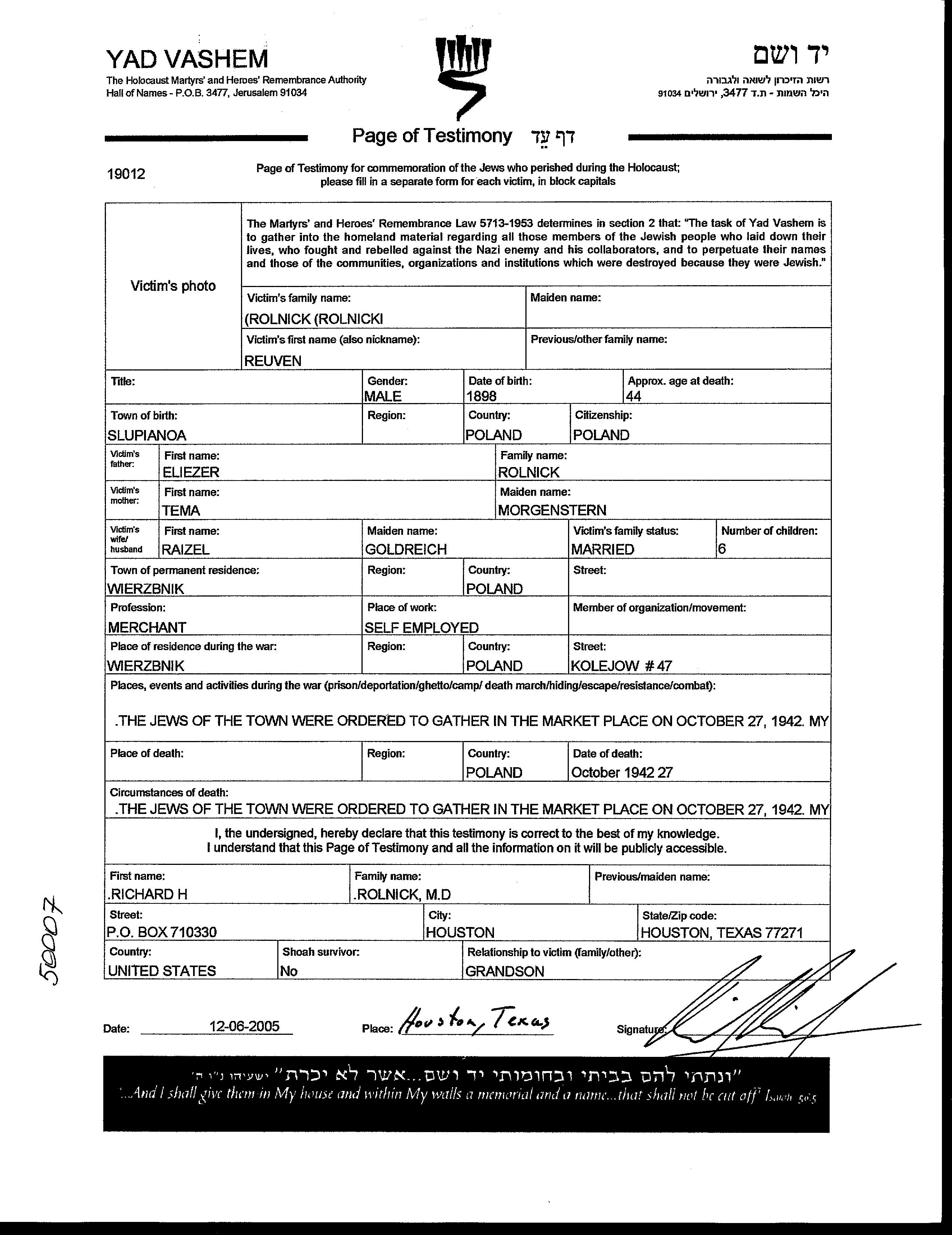 Reuven Rolnicki Rolnick wurde im Jahr 1898 in Slupia Nowa, Polen geboren. Er war der Sohn von Eliezer und Tema, geb. Morgenstern. Er war Kaufmann/-frau und mit Raizel, geb. Goldreich Verheiratet. Vor dem Zweiten Weltkrieg lebte er in Wierzbnik, Polen. Während des Krieges war er in Wierzbnik, Polen.