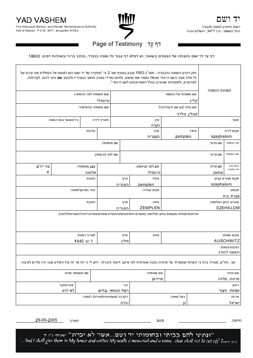 Golda Katalin Klein, geb. Grunfeld wurde in Szephalom, Ungarn geboren. Sie war Hausfrau und mit Shimon Witwe. Vor dem Zweiten Weltkrieg lebte sie in Szephalom, Ungarn. Während des Krieges war sie in Szephalom, Ungarn.