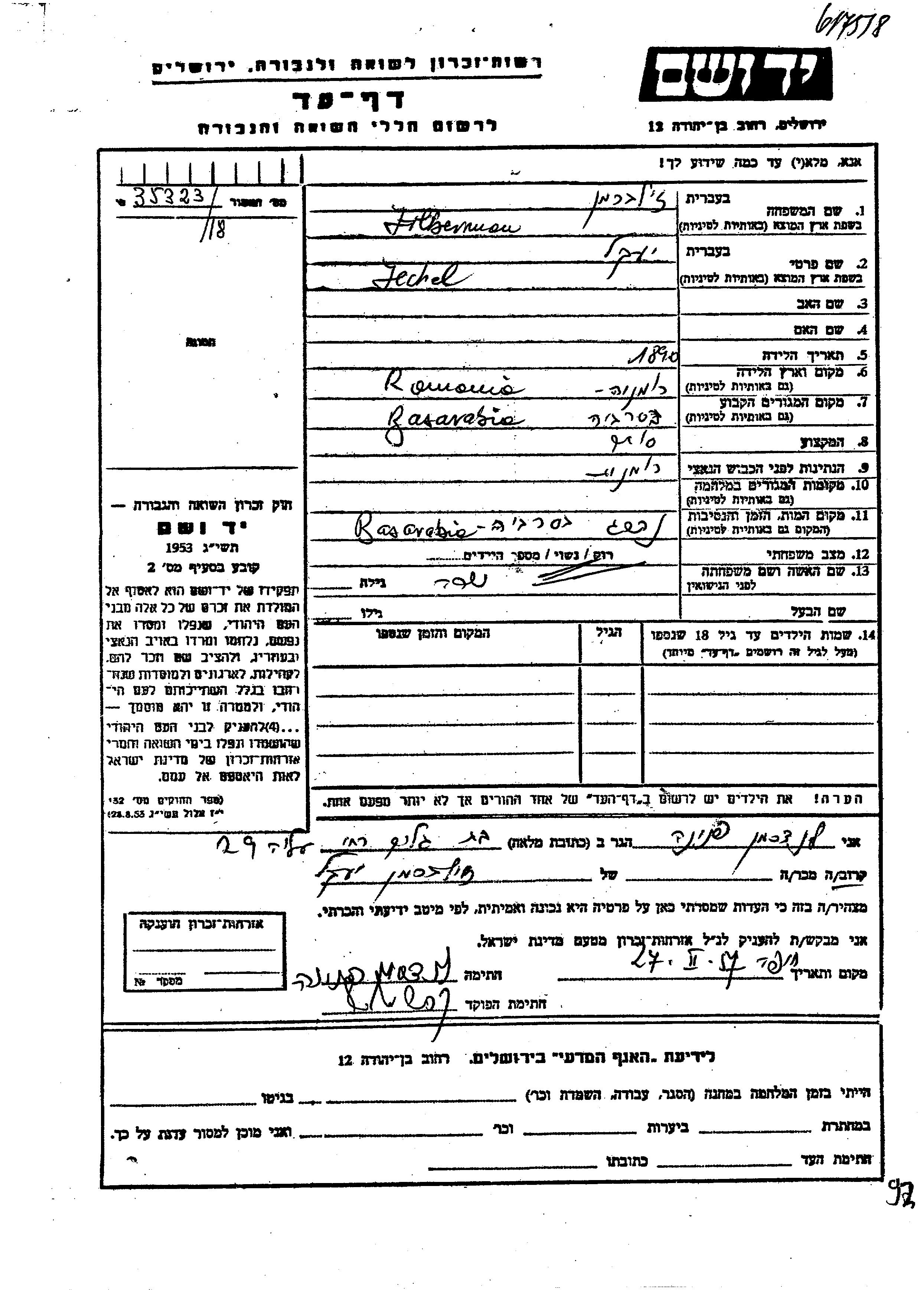 Yechel Yaakov Zilberman wurde im Jahr 1890 in Rumänien geboren. Er war Kaufmann/-frau und mit Sara Verheiratet. Vor dem Zweiten Weltkrieg lebte er in Bessarabia, Rumänien.