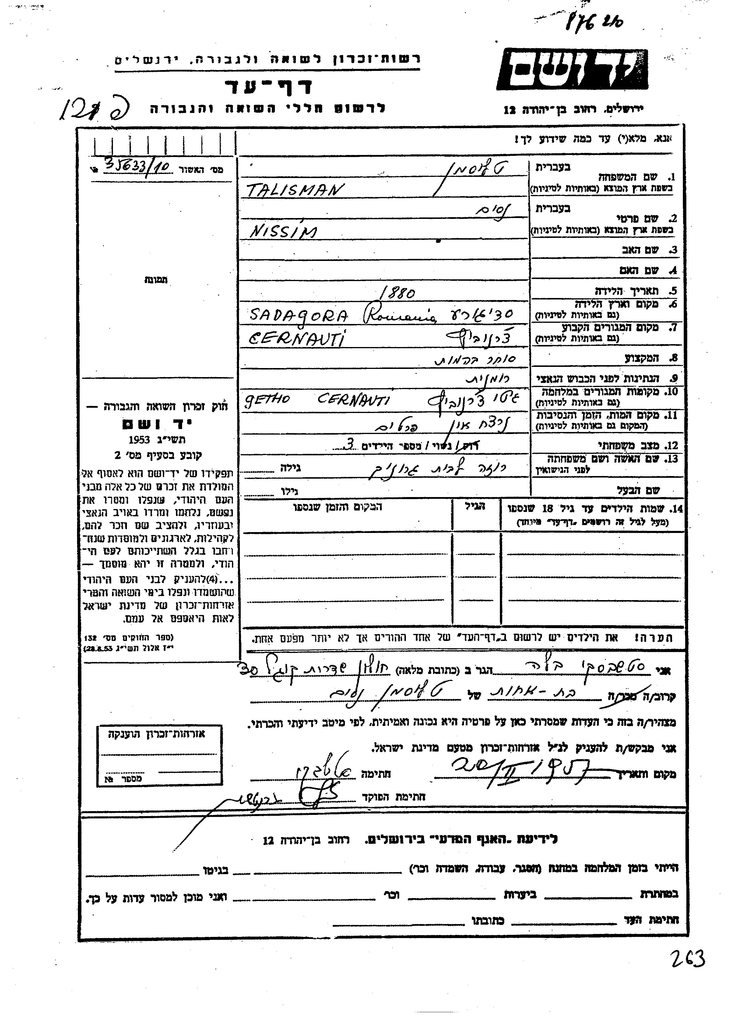Nissim Talisman wurde im Jahr 1880 in Sadigora, Rumänien geboren. Er war Viehhändler und mit Roza, geb. Geronik Verheiratet. Vor dem Zweiten Weltkrieg lebte er in Cernauti, Rumänien. Während des Krieges war er in Cernauti, Rumänien.