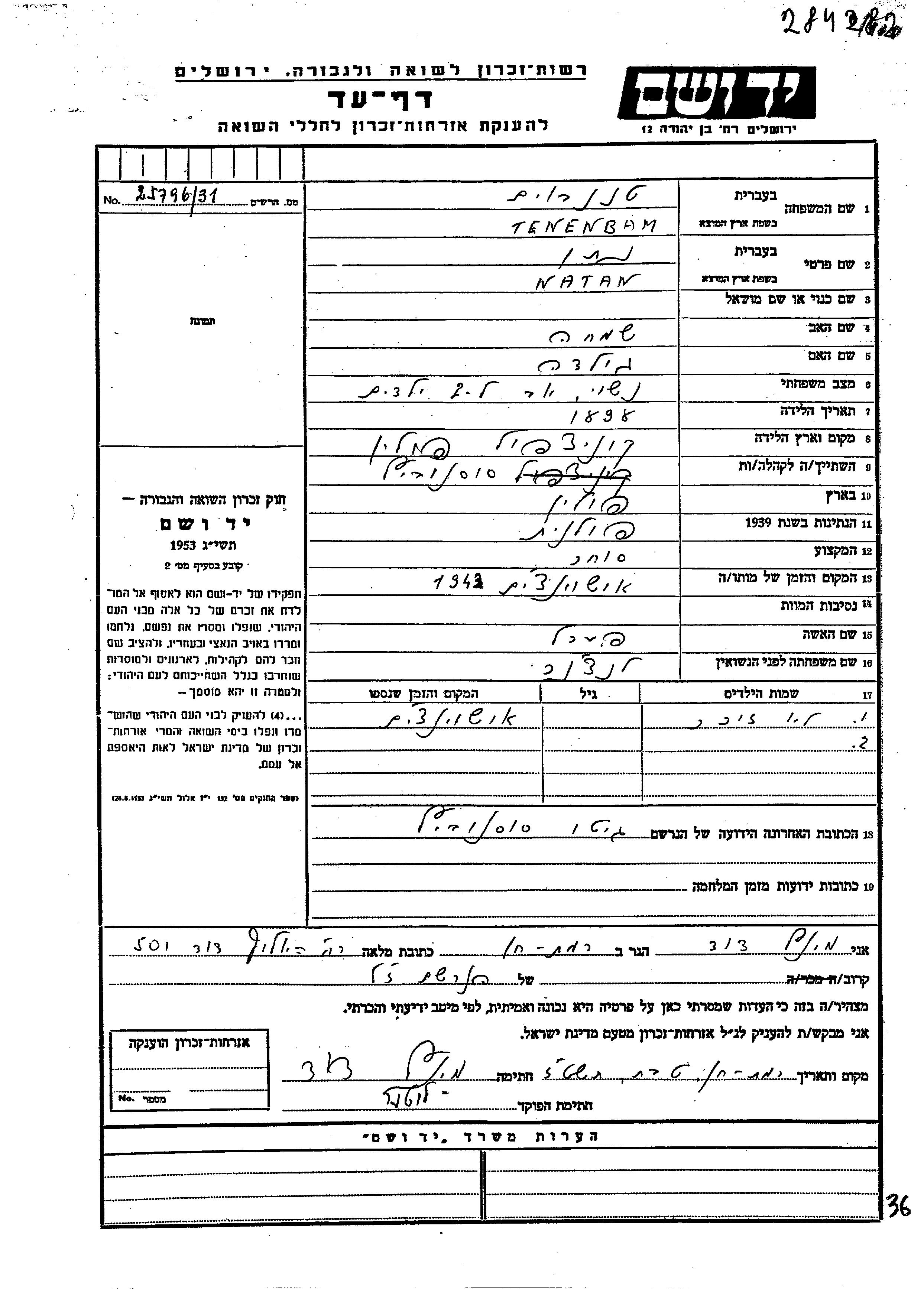 Natan Tenenbam wurde im Jahr 1898 in Koniecpol, Polen geboren. Er war der Sohn von Simkha und Golda. Er war Kaufmann/-frau und mit Perl, geb. Lanchner Verheiratet. Vor dem Zweiten Weltkrieg lebte er in Koniecpol, Polen. Während des Krieges war er in Sosnowiec, Polen.