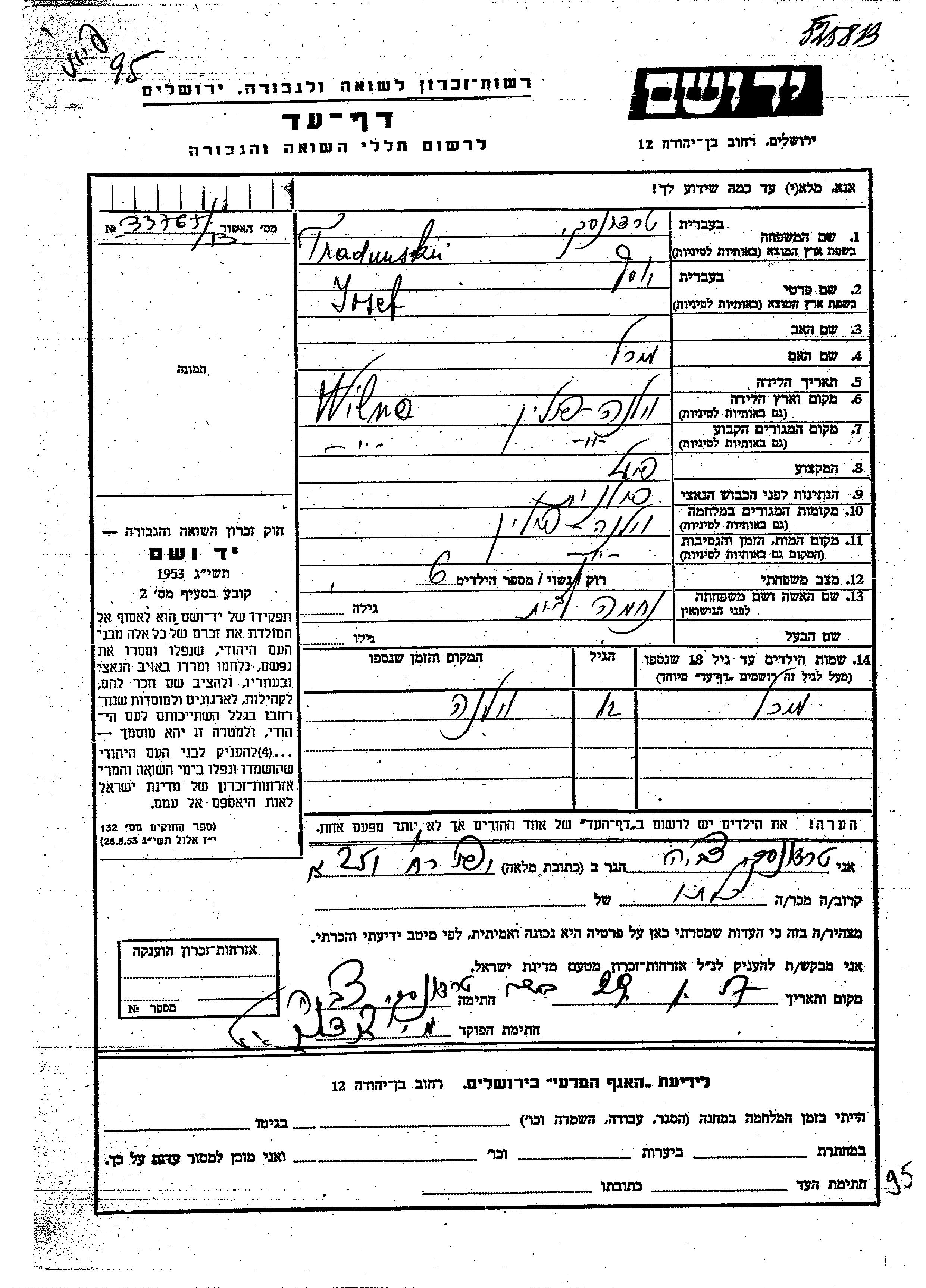 Josef Tradunski wurde in Wilno, Polen geboren. Er war der Sohn von Mirl. Er war Arbeiter/-in und mit Nekhama Verheiratet. Vor dem Zweiten Weltkrieg lebte er in Wilno, Polen. Während des Krieges war er in Wilno, Polen.