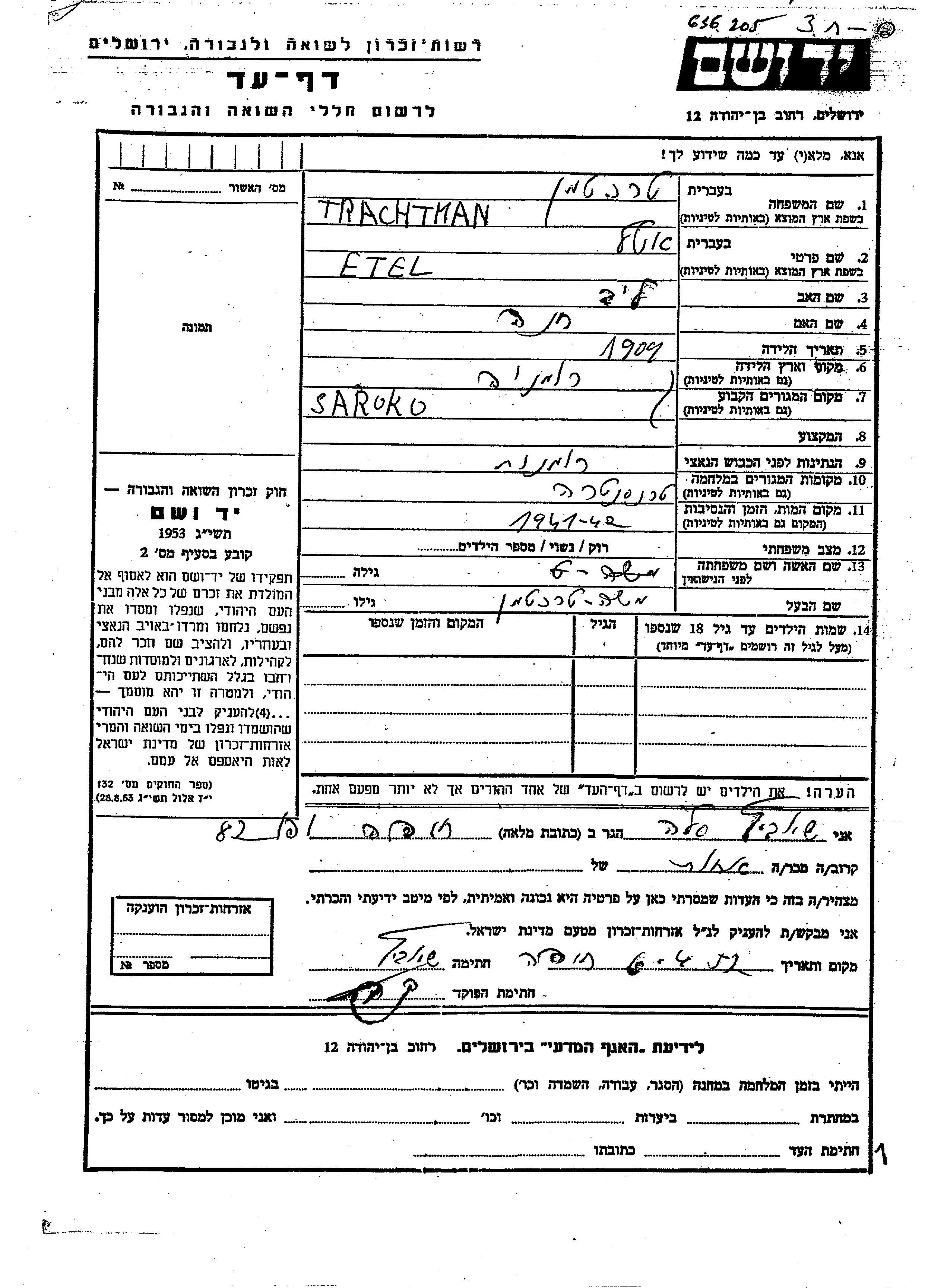 Etel Trakhtman wurde im Jahr 1909 in Saroko, Rumänien geboren. Sie war die Tochter von Leib und Khana. Vor dem Zweiten Weltkrieg lebte sie in Saroko, Rumänien. Während des Krieges war sie in Transnistria, Ukraine (UdSSR).