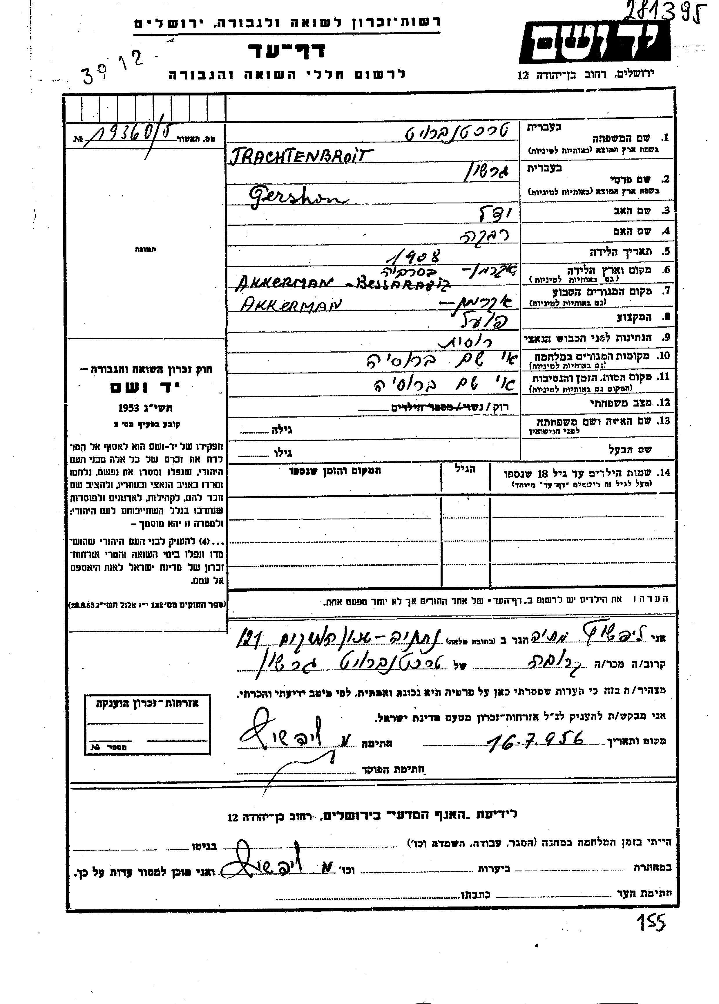 Trakhtenbroit Gershon 1908 Akerman, Rumänien Gedenkblatt