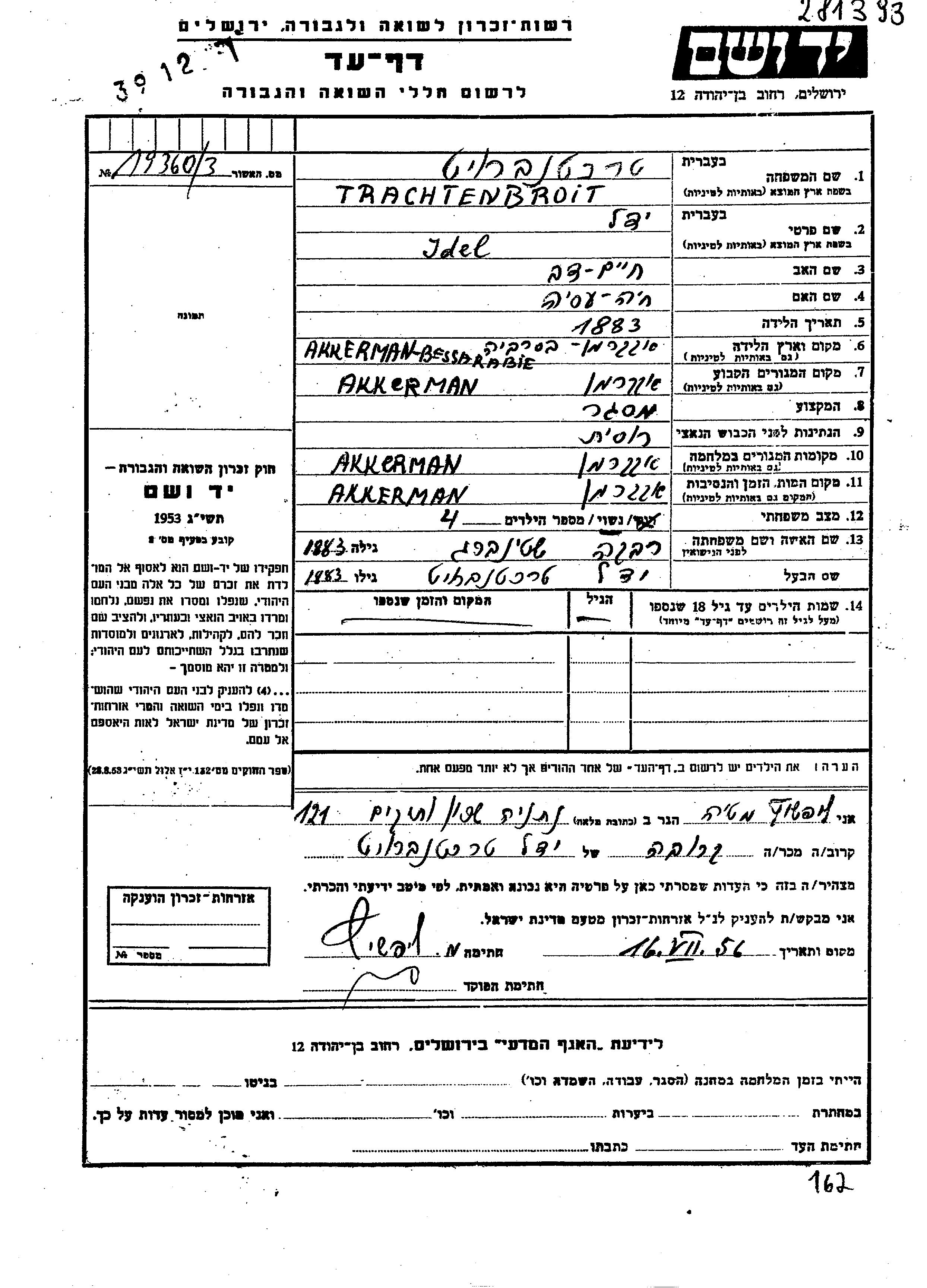 Jidel Trakhtenbroit wurde im Jahr 1883 in Akkerman, Rumänien geboren. Er war der Sohn von Khaim Dov und Esia Khaia. Er war Schlosser und mit Rivka, geb. Shteinberg Verheiratet. Vor dem Zweiten Weltkrieg lebte er in Akkerman, Rumänien. Während des Krieges war er in Akkerman, Rumänien.