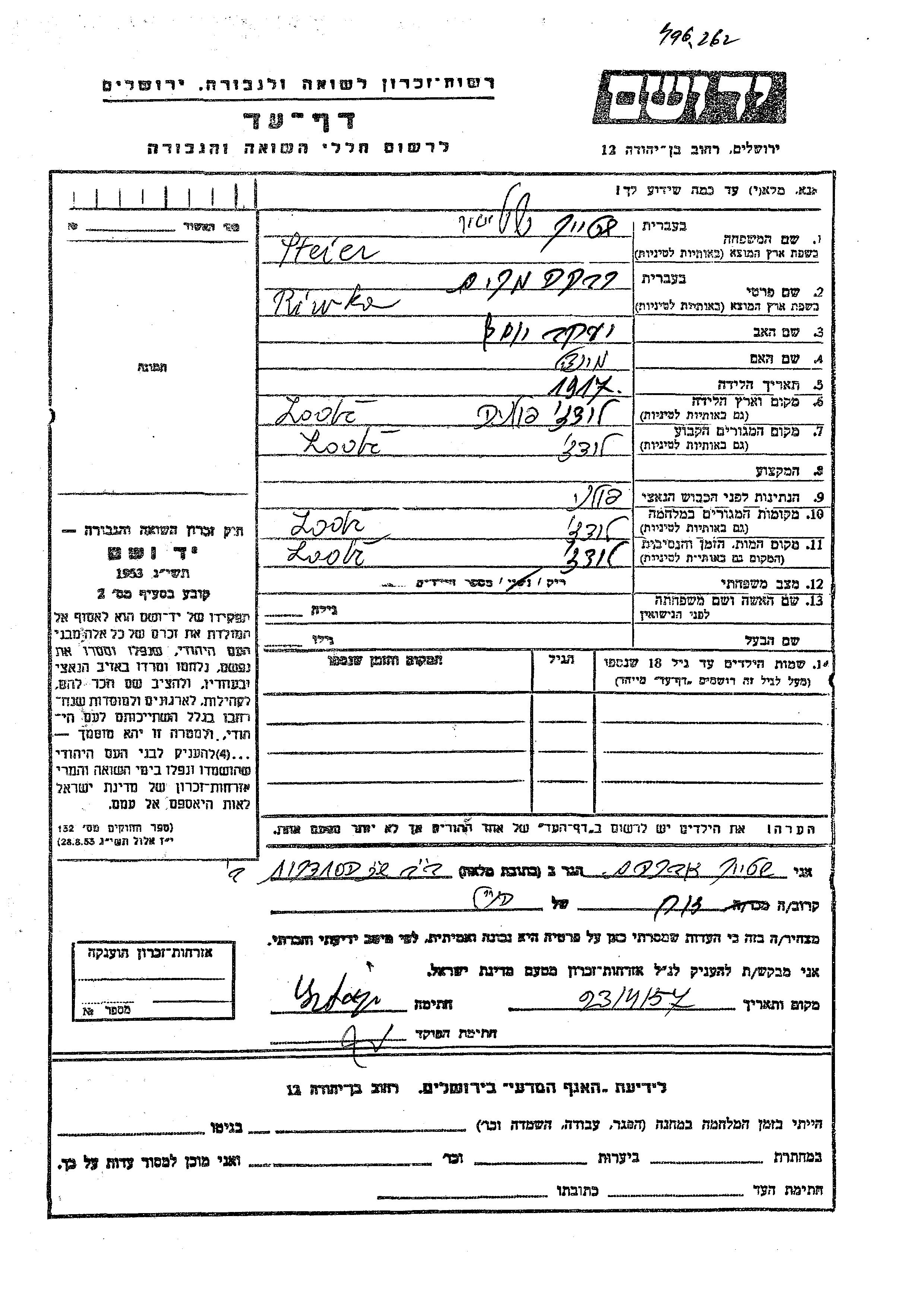 Riwka Shteir wurde im Jahr 1917 in Lodz, Polen geboren. Sie war die Tochter von Yaakov Yosef und Mindl. Sie war Ledig. Vor dem Zweiten Weltkrieg lebte sie in Lodz, Polen. Während des Krieges war sie in Lodz, Polen.