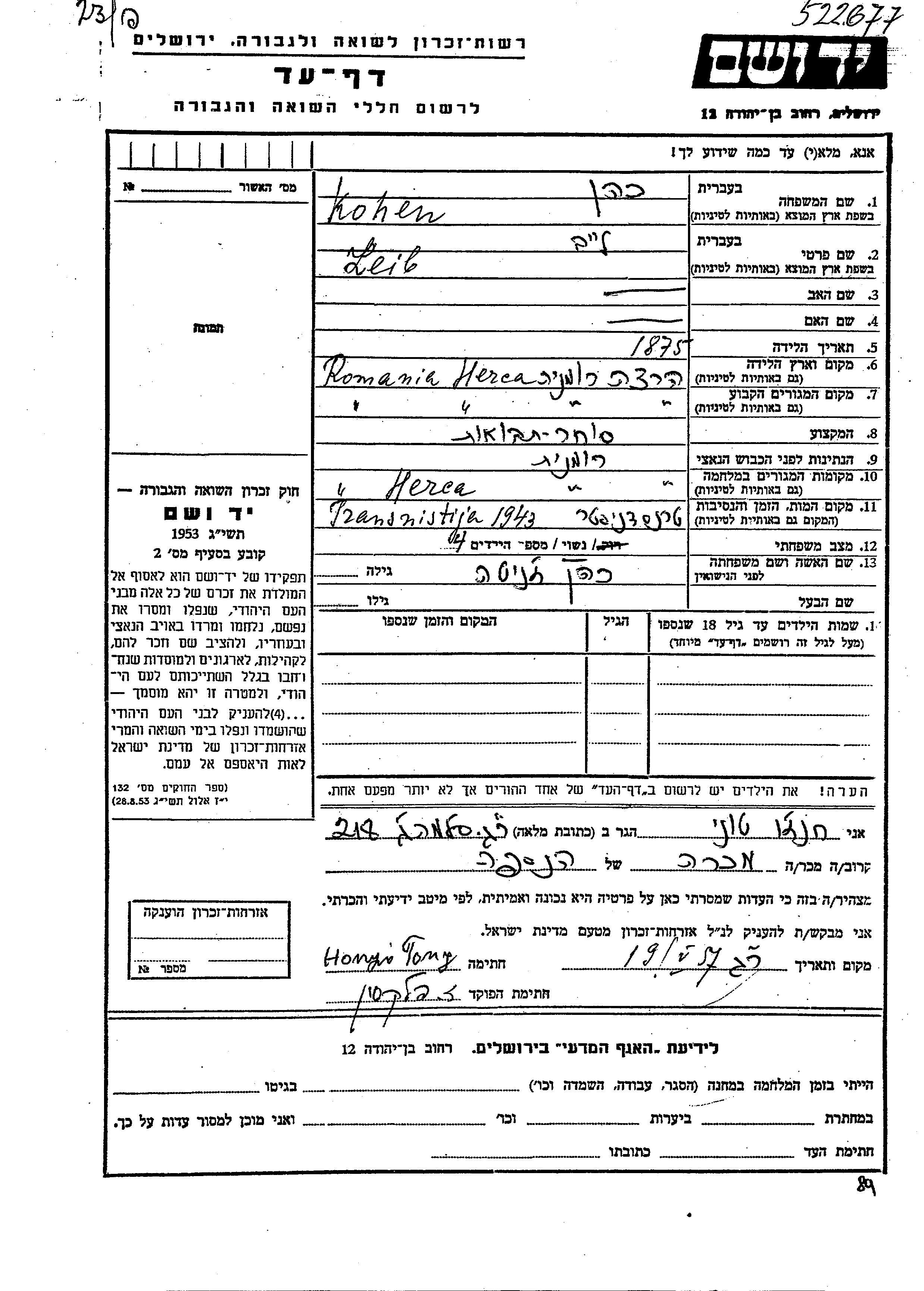 Leib Kohen wurde im Jahr 1875 in Herca, Rumänien geboren. Er war Getreidehändler/-in und mit Zhana Verheiratet. Vor dem Zweiten Weltkrieg lebte er in Herca, Rumänien. Während des Krieges war er in Herca, Rumänien.