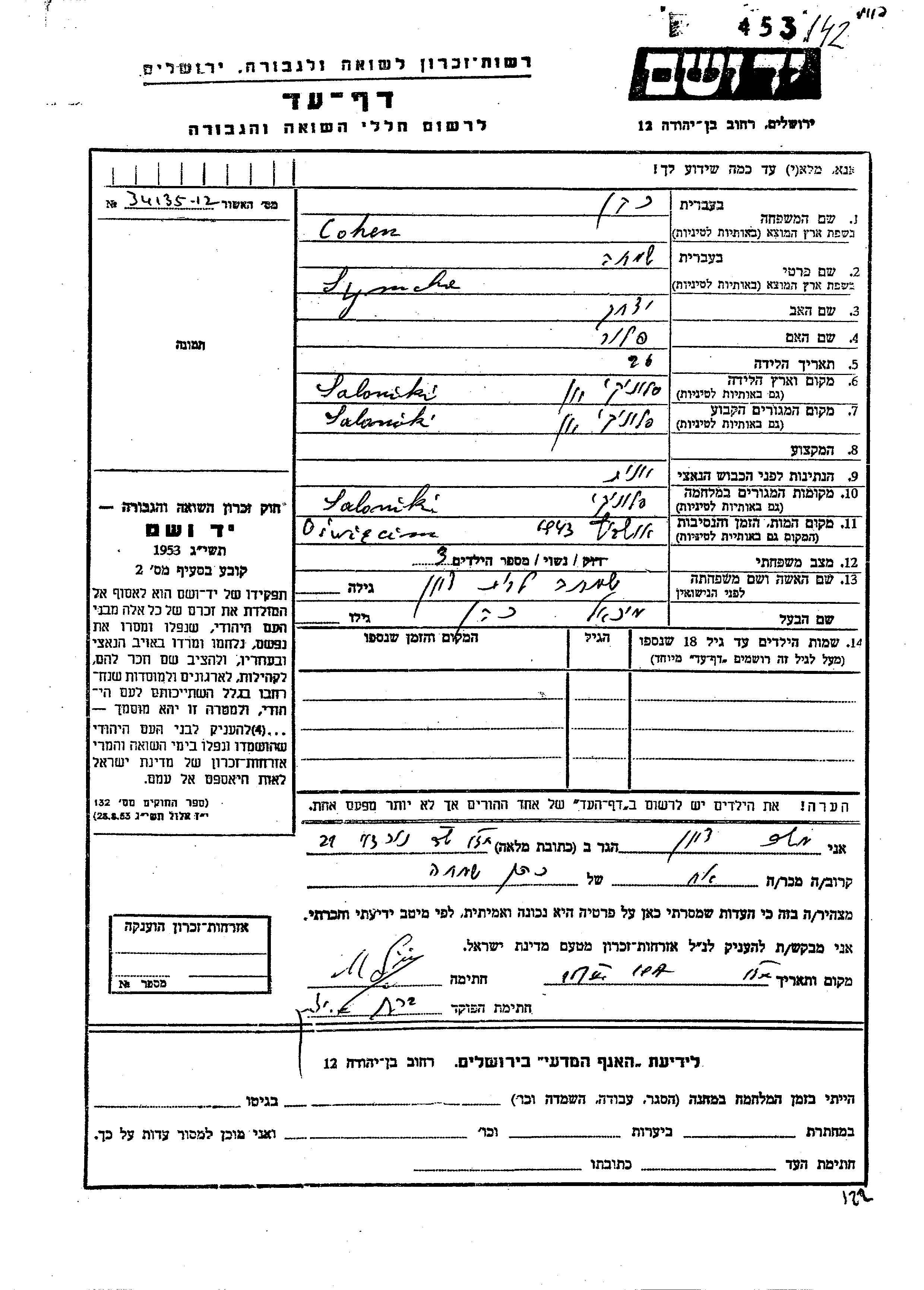 Simkha Cohen, geb. Tzion wurde in Salonika, Griechenland geboren. Sie war die Tochter von Yitzkhak und Flor. Sie war mit Mikhael Verheiratet. Vor dem Zweiten Weltkrieg lebte sie in Salonika, Griechenland. Während des Krieges war sie in Salonika, Griechenland.