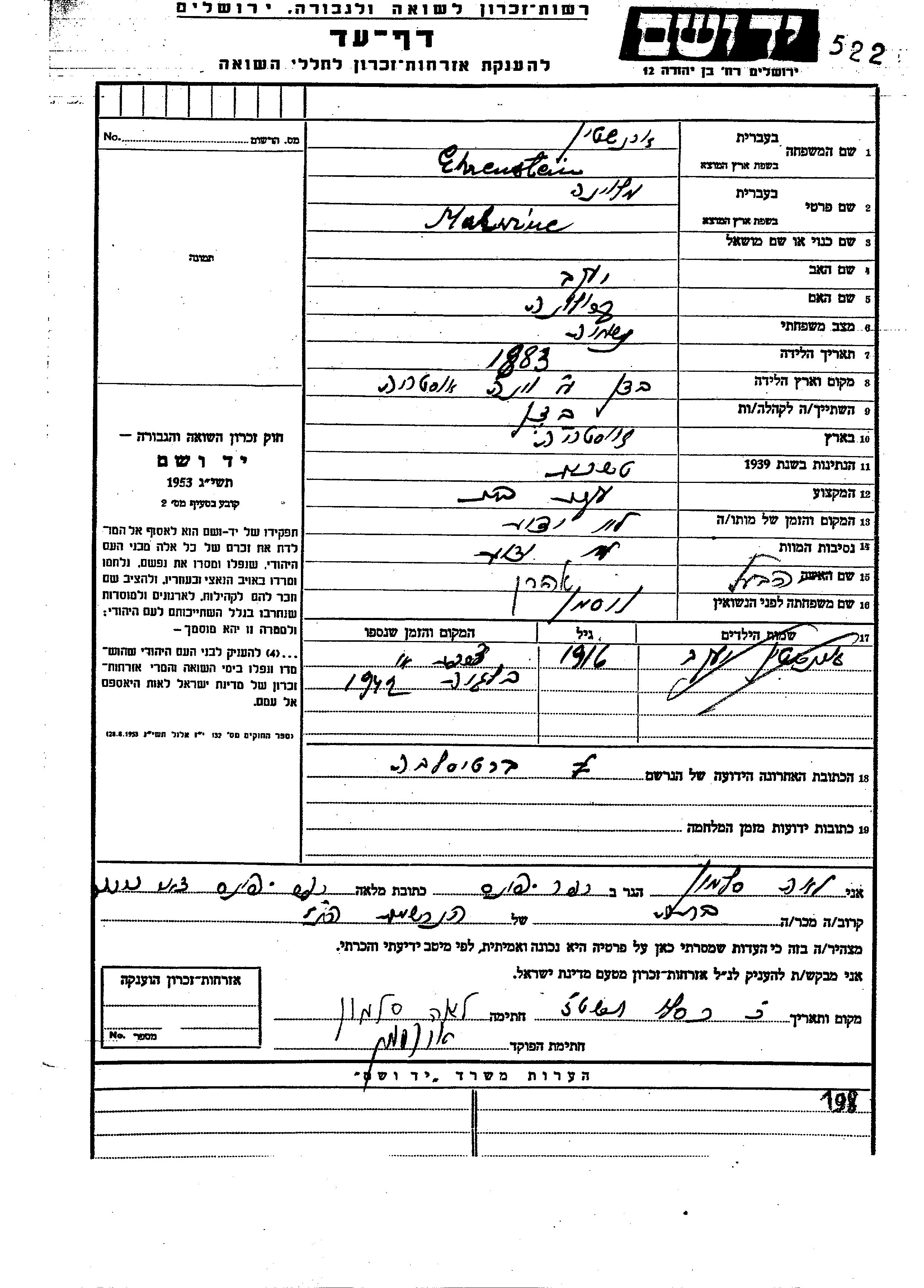 Malvina Erenshtein wurde im Jahr 1883 in Baden bei Wien, Österreich geboren. Sie war die Tochter von Yaakov und Karolina. Sie war Hausfrau und mit Aharon, geb. Visman Verheiratet. Vor dem Zweiten Weltkrieg lebte sie in Baden bei Wien, Österreich. Während des Krieges war sie in Bratislava, Tschechoslowakei.