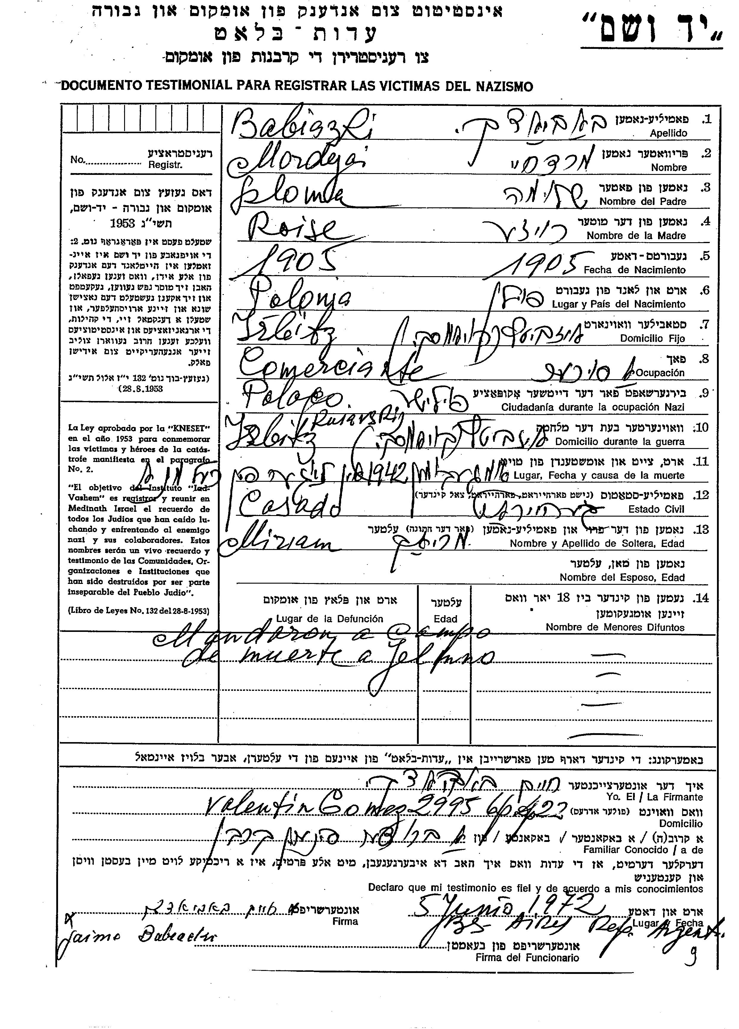 Mordekhai Babiazki wurde im Jahr 1905 in Izbica, Polen geboren. Er war der Sohn von Shlomo und Roiza. Er war Kaufmann/-frau und mit Miriam Verheiratet. Vor dem Zweiten Weltkrieg lebte er in Izbica, Polen.